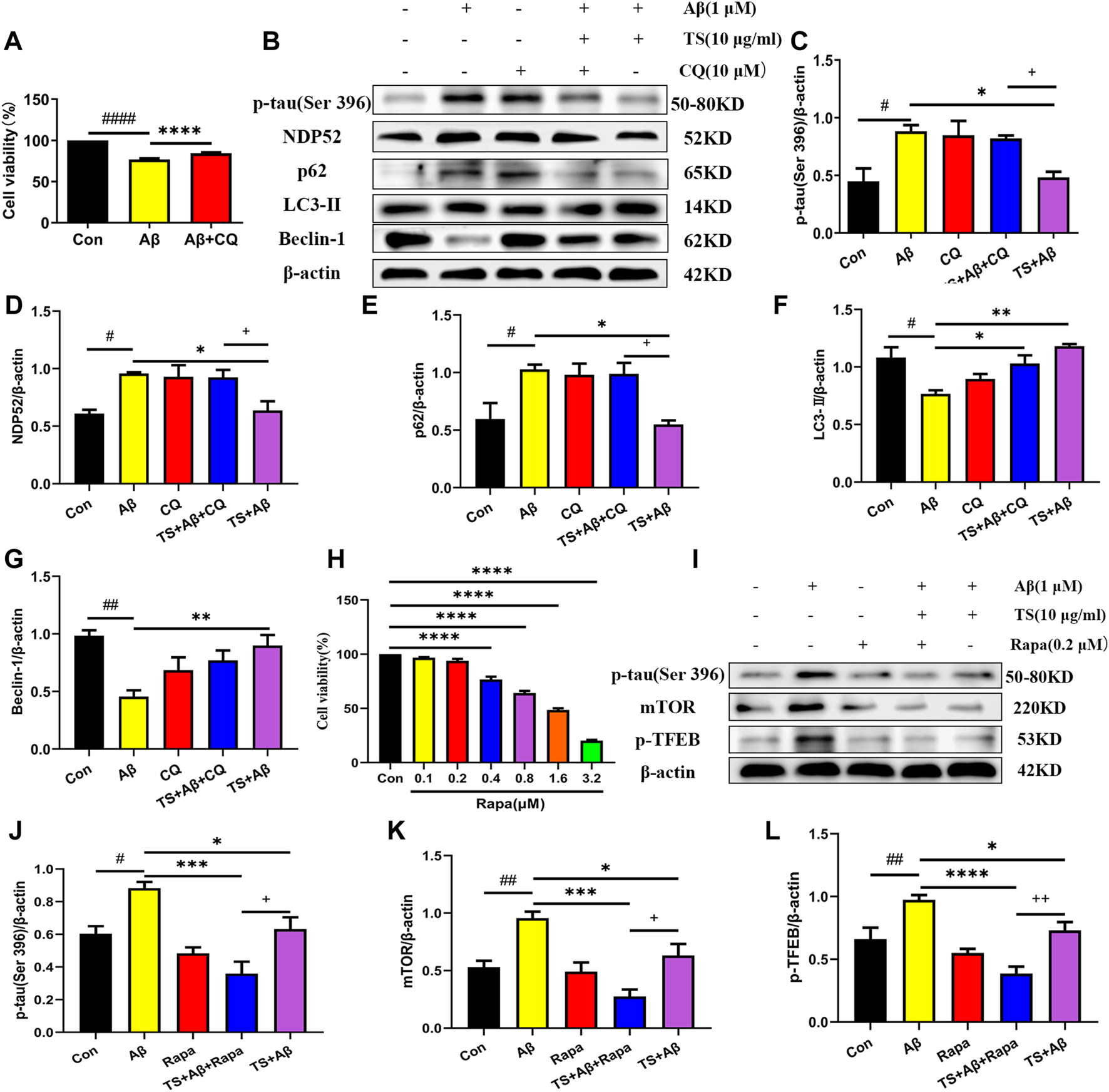 TS promoted autophagy in Aβ-induced PC12 cells to clear p-tau. (A) The effect of CQ on the survival rate of Aβ-induced PC12 cells for 24 h was evaluated by MTT assay (####p < 0.0001, ****p < 0.0001). (B) The effects of CQ on expression of p-tau (Ser 396), NDP52, p62, LC3-II and Beclin-1 proteins in the Aβ-induced PC12 cells after TS treatment were detected by Western blot. (C) Quantitative analysis of the relative expression level of p-tau (Ser 396) protein in each group (#p = 0.0128, *p = 0.0205, +p = 0.0495). (D) Quantitative analysis of the relative expression level of NDP52 protein in each group (#p = 0.0134, *p = 0.0217, +p = 0.0386). (E) Quantitative analysis of the relative expression level of p62 protein bands in each group (#p = 0.0226, *p = 0.0124, +p = 0.0200). (F) Quantitative analysis of the relative expression level of LC3-II protein in each group (#p = 0.0101, *p = 0.0277, **p = 0.0016). (G) Quantitative analysis of the relative expression level of Beclin-1 protein in each group (##p = 0.0013, **p = 0.0056). (H) MTT assay was used to test the effect of Rapa on PC12 cells for 24 h (****p < 0.0001). (I) The effects of Rapa on expression of p-tau (Ser 396), mTOR and p-TFEB proteins in the Aβ-induced PC12 cells after TS treatment were detected by Western blot. (J) Quantitative analysis of the relative expression level of p-tau (Ser 396) protein in each group (#p = 0.00175, ***p = 0.0002, *p = 0.0315, +p = 0.0442). (K) Quantitative analysis of the relative expression level of mTOR protein in each group (##p = 0.0062, ***p = 0.0002, *p = 0.0305, +p = 0.0250). (L) Quantitative analysis of the relative expression level of p-TFEB protein in each group (##p = 0.0041, ****p < 0.0001, *p = 0.0288, ++p = 0.0081). #: Compared with WT group; *Compared with model group; +Comparing with TS+Aβ group. Data are presented as mean ± SEM (n = 3).