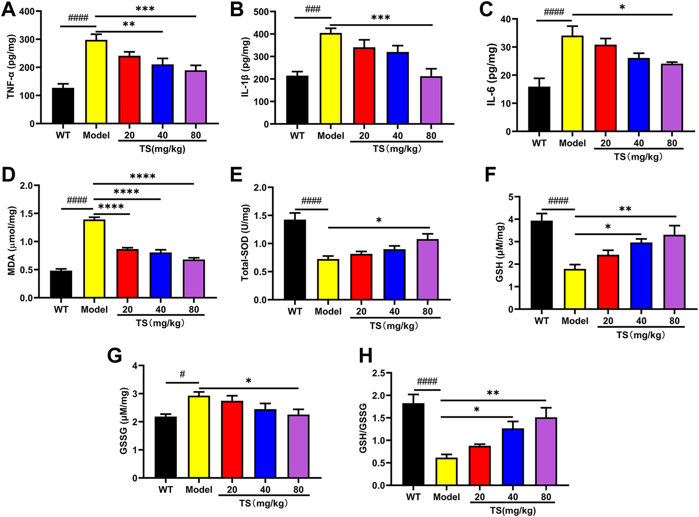 TS treatment inhibited cerebral inflammation and oxidative stress in APP/PS1 mice. (A) The effect of TS on the levels of TNF-α in the brain of APP/PS1 mice was measured by ELISA (####p < 0.0001, **p = 0.0065, ***p = 0.0008). (B) The effect of TS on the levels of IL-1β in the brain of APP/PS1 mice was measured by ELISA (###p 0.0002, ***p = 0.0002). (C) The effect of TS on the levels of IL-6 in the brain of APP/PS1 mice was measured by ELISA (####p < 0.0001, *p = 0.0209). (D) The effect of TS on the levels of MDA in the brain of APP/PS1 mice was measured by ELISA (####p < 0.0001, ****p < 0.0001). (E) The effect of TS on the levels of SOD in the brain of APP/PS1 mice was measured by ELISA (####p < 0.0001, *p = 0.0129). (F) The effect of TS on the levels of GSH in the brain of APP/PS1 mice was measured by ELISA (####p < 0.0001, *p = 0.0177, **p = 0.0020). (G) The effect of TS on the levels of GSG in the brain of APP/PS1 mice was measured by ELISA (#p = 0.0123, *p = 0.0248). (H) Quantitative analysis of the ratio of GSH/GSSG (####p < 0.0001, *p = 0.0178, **p = 0.0010). #Compared with WT group; *Compared with model group. Data are presented as mean ± SEM (n = 6).