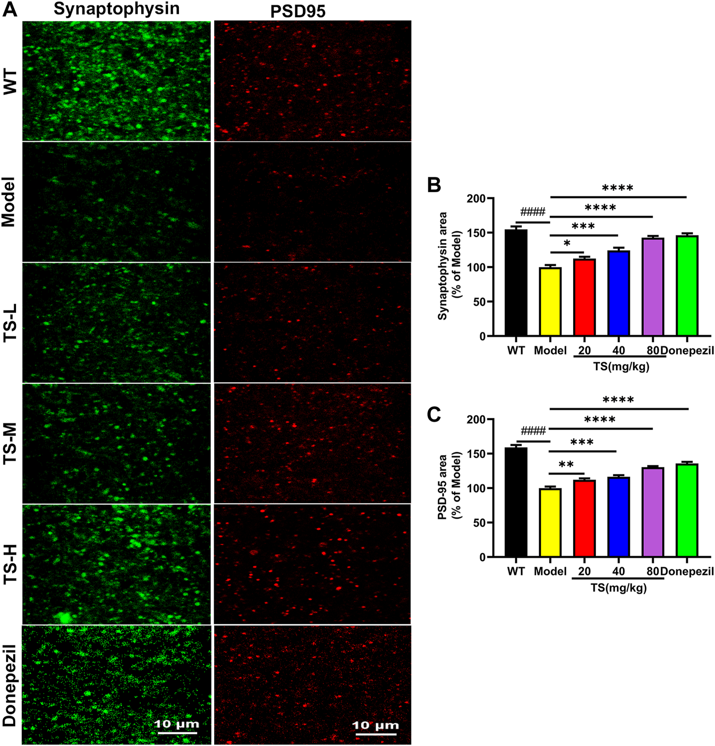 Synaptic loss is an important pathological feature of AD, which is highly correlated with cognitive function impairment in AD patients or animal models (John & Reddy, 2021). Presynaptic protein synaptophysin and postsynaptic protein PSD-95 are two synaptic marker proteins (John & Reddy, 2021). Postsynaptic density protein PSD-95 is the main scaffold protein of dendritic spine coordinating the relationship between neurotransmitters and receptors, and ultimately determining the synaptic response (Savioz et al., 2014; John & Reddy, 2021). Synaptophysin and PSD-95 immunofluorescence assay was performed to verify the effect of TS on synaptic loss. The results of immunofluorescence staining in mice brain showed that the levels of synaptophysin (Figures 10A,B, p < 0.0001) and PSD-95 (Figures 10A,C, p < 0.0001) in the brain of AD mice were significantly lower than those of WT mice. While TS treatment could significantly increase the levels of synaptophysin (Figures 10A,B) and PSD-95 (Figures 10A,C), suggesting that TS treatment could effectively prevent synaptic loss in the brain of AD mice.