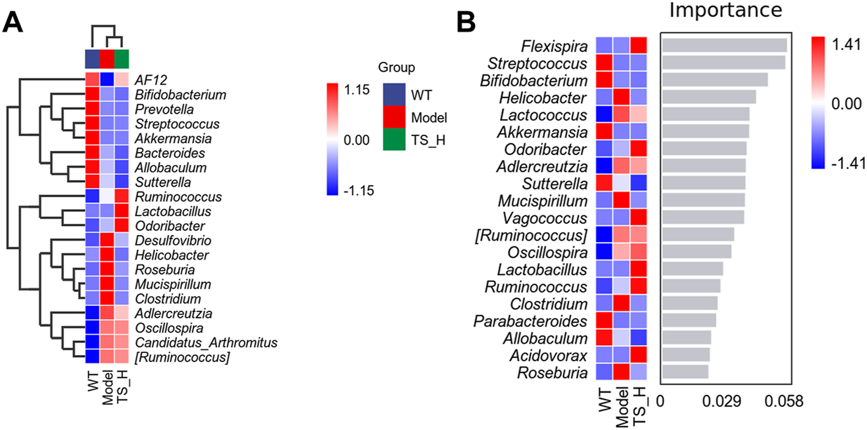 The effect of TS on the NOR ability impairment in APP/PS1 mice was evaluated by NOR test. The results showed that compared with WT mice, the DI of APP/PS1 mice was significantly lower than that of WT mice (Figure 2E, p < 0.0001). After middle and high-dose TS treatment, the DI significantly increased, indicating that TS could improve NOR ability in APP/PS1 mice (Figure 2E, p < 0.01 and p < 0.0001 respectively). Collectively, these data indicated that TS treatment could significantly alleviate cognitive impairment in APP/PS1 mice.