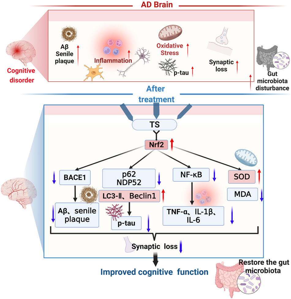 The present study aimed to investigate the therapeutic effect of TS on APP/PS1 transgenic mice and underlying mechanisms. The results reveal that TS downregulated the transcription and expression level of BACE1 through the Nrf2 pathway to reduce Aβ production and senile plaque deposition. The inhibitory effect of TS on BACE1 transcription was achieved by promoting the binding of Nrf2 and the promoter of BACE1 ARE1. In addition, TS promoted autophagy by regulating the expression of autophagic proteins, thereby reducing the level of p-tau. In the aspect of neuroinflammation, TS could downregulate NF-κB transcription and expression through Nrf2, thus inhibiting the activation of glial cells and reducing the production of inflammatory factors. TS was found to ameliorate synaptic loss and alleviate oxidative stress. Furthermore, TS could reverse the GM disorder in APP/PS1 mice and improve the diversity of GM. Collectively, this study can provide a new insight and potential approach for the treatment of AD.