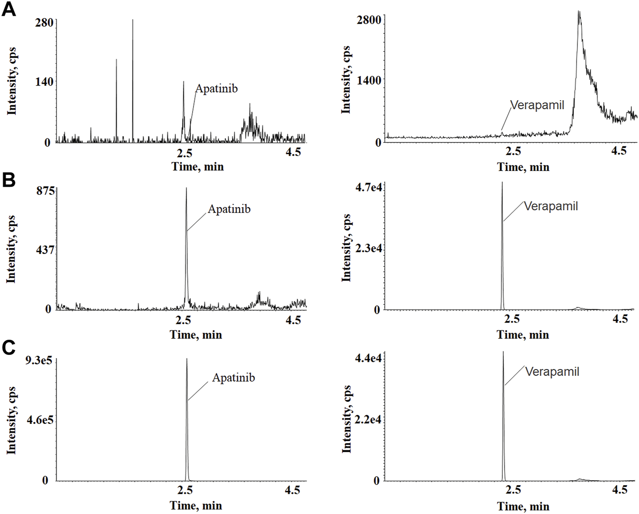 FIGURE 1. (A) Blank rat plasma sample. (B) Blank plasma sample spiked with 5 ng/ml of apatinib and 200 ng/ml of IS. (C) A plasma sample collected at 3 h after intragastrical administration of.