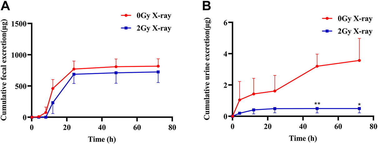 FIGURE 4. The mean cumulative fecal (A) and urine (B) excretion of apatinib in rat presence or absence abdominal X-ray irradiation after intragastrical administration of 45 mg/kg (Mean ± SD, n = 3). The t-test was used for data analysis between the two groups. * significantly different from the absence X-ray irradiation group at p < 0.05, ** significantly different from the absence X-ray irradiation group at p < 0.01.