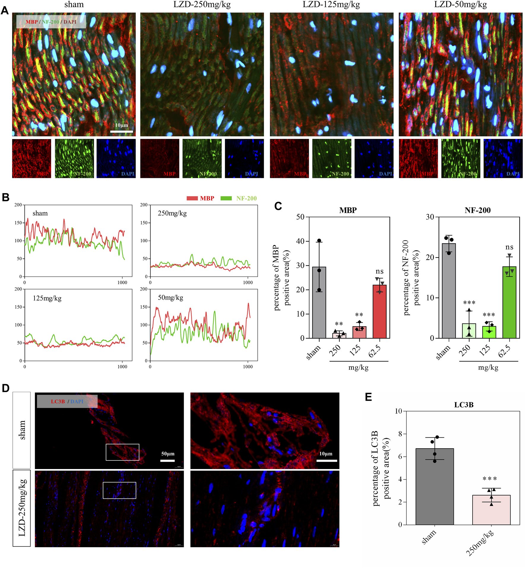 Effects of linezolid on the sciatic nerve in rats. (A–C) Representative images and quantitative analysis of sciatic nerve sections stained with anti-MBP antibody (red) and anti-NF-200 antibody (green) in rats (scale bar = 10 μm). (D,E) Immunofluorescence images and analysis of sciatic nerve in rats. Red represents anti-LC3B antibody (scale bar = 50 and 10 μm). **p < 0.01, ***p < 0.001 vs. the sham group.