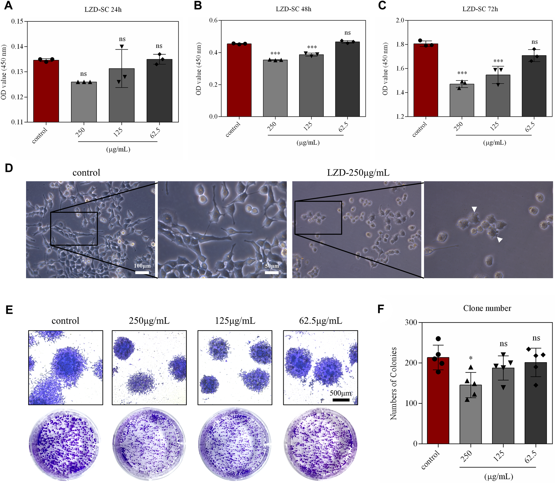 In-vitro simulation of linezolid-induced damage to SCs. (A–C) The effect of different concentrations of linezolid on SCs proliferation. (D) Morphology of SCs under a light microscope (scale bar = 100 and 50 μm). (E,F) Effects of different concentrations of linezolid on the colony-forming ability of SCs (scale bar = 500 μm). *p < 0.05, ***p < 0.001 vs. the sham group.