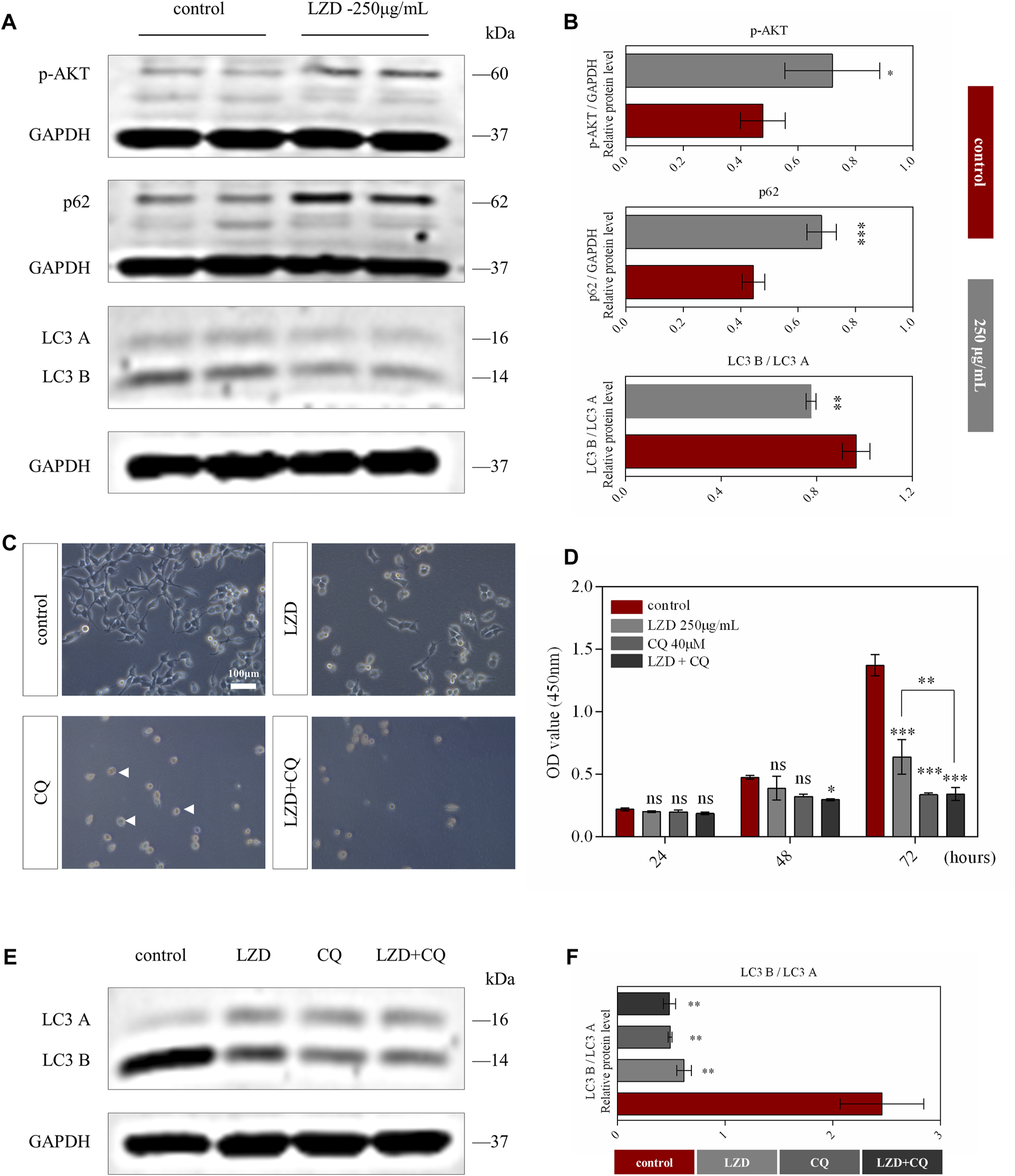 Autophagic flux was inhibited by linezolid. (A) Protein expression of p-AKT, p62, and LC3A/B in SCs from the linezolid-treated group. (B) Intensities of p-AKT, p62, and LC3A/B were normalized to GADPH. (C) Morphological characteristics of SCs after exposure to CQ (40 μM) and linezolid for 72 h (scale bar = 100 μm). (D) The proliferation of SCs in different groups was detected using the CCK8 assay. (E) Expression of protein LC3A/B in SCs after adding CQ and linezolid for 72 h. (F) Intensities of LC3A/B normalized to GADPH. *p < 0.05, **p < 0.01, ***p < 0.001 vs. the sham group.