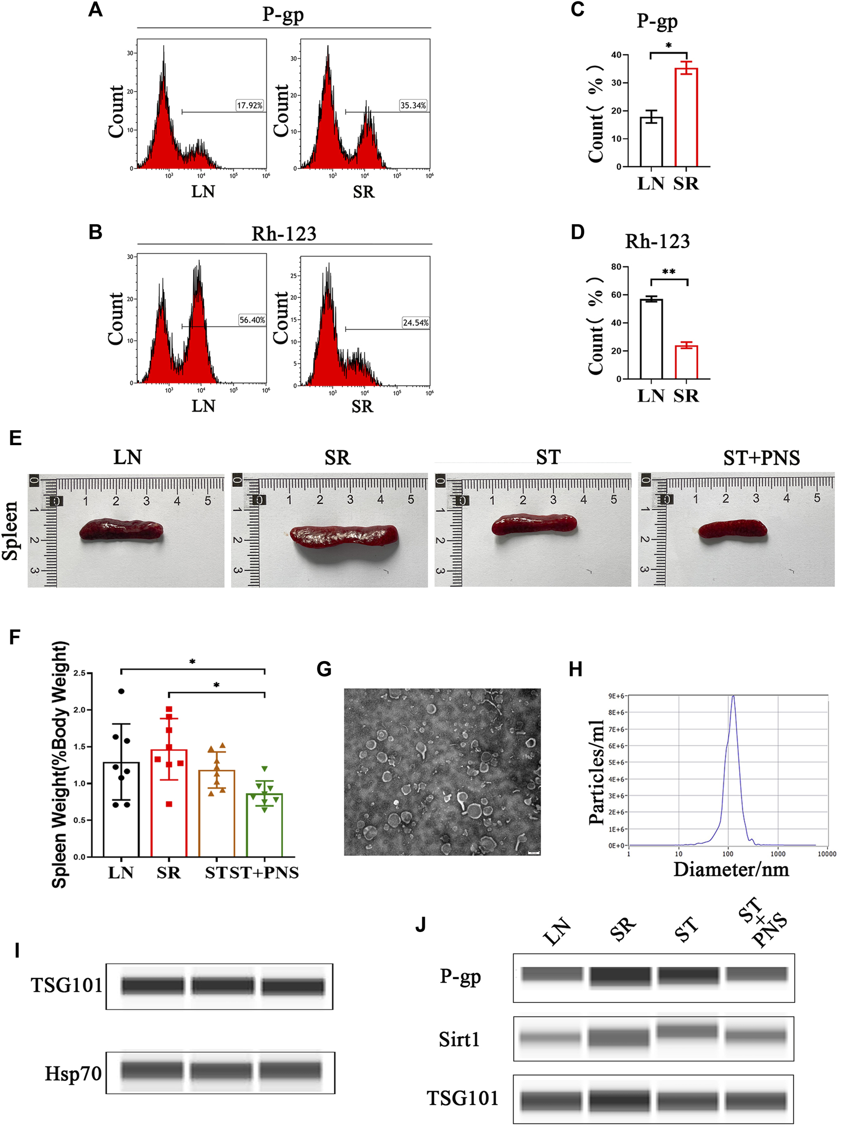 Validation of the SR-LN model and differential information expression of exosomes within the four groups. (A–D) Flow cytometry was used to detect P-gp expression and Rh-123 accumulation in splenic lymphocytes. (E) Images of one randomly selected mouse spleen per group and (F) The spleen index of each group of mice. (G) The morphology and structure of exosomes were photographed by transmission electron microscopy (scale bar 200 nm). (H) The particle size of the exosomes was detected by NTA. (I) Detection of the exosome markers TSG101 and Hsp70 by capillary immunoassays. (J) Capillary immunoassay analysis of exosome Sirt1 and P-gp protein expression in splenic Lyme-Exos extracted from each group. TSG101 is an exosome marker protein that acts as an internal reference. All data are expressed as the mean ± standard deviation from independent groups, *p < 0.05, **p < 0.01.
