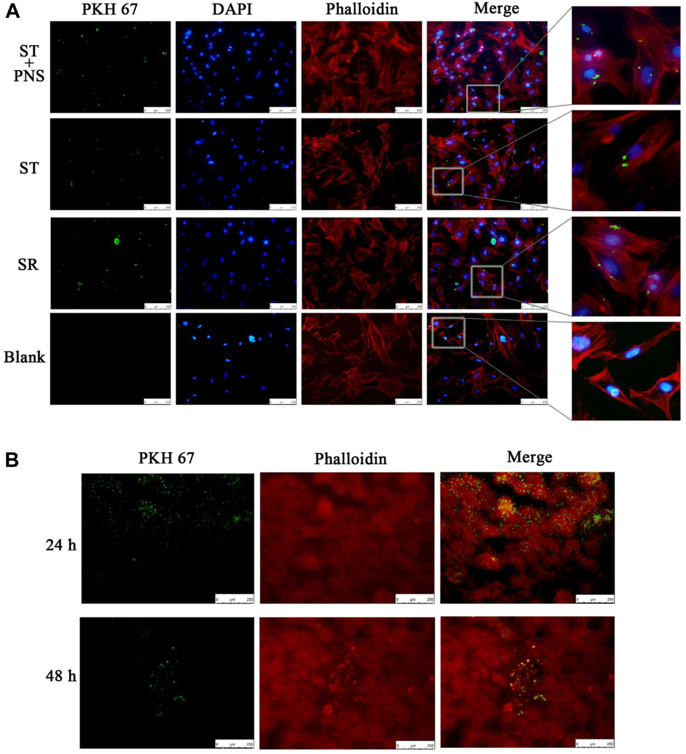 Levels of exosome uptake by kidney. (A) Uptake of PKH67-labeled exosomes (green fluorescence) by GECs (red and blue fluorescence, phalloidin and DIPA-stained cytoskeleton) in each group by cellular immunofluorescent staining. A blank control group was set up in parallel (scale bar 250 μm; enlarged image). (B) After the injection of PKH67-labeled exosomes into the tail vein, the mice were sacrificed at 24 and 48 h. The kidney cortex was taken for frozen sectioning. The uptake of PKH67-labeled exosomes (ultracentrifugation to remove excess dye) was observed in the kidney (scale bar 250 μm).