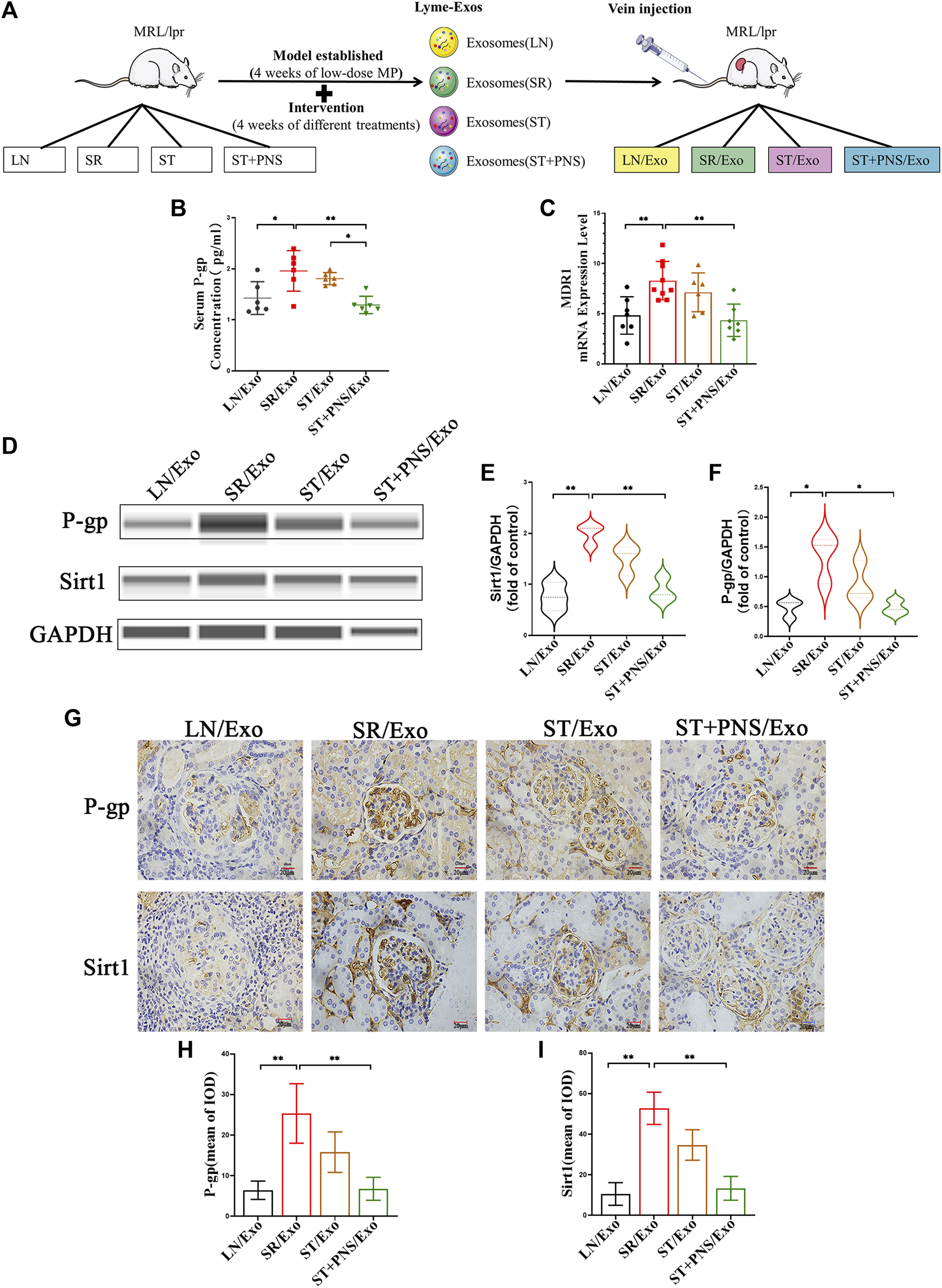 Untreated LN mice were randomly divided into four groups and were injected with exosomes obtained after 8 weeks of different drug interventions (the LN/Exo group was injected with exosomes from the LN group, the SR/Exo group was injected with exosomes from the SR group, the ST/Exo group was injected with exosomes from the ST group, and the ST + PNS/Exo group was injected with exosomes from the ST + PNS group) (Figure 3A). Compared with those in the SR/Exo group, the serum P-gp levels were significantly decreased in the ST + PNS/Exo group mice and were lower than those in the ST group (Figure 3B). Renal cortical MDR1 mRNA (Figure 3C) and Sirt1 and P-gp protein expression were significantly downregulated (Figures 3D–F). Immunohistochemical results: the expression of glomerular Sirt1 and P-gp showed the same results (Figures 3G–I). It was suggested that PNS reversed the P-gp-mediated expression of the relevant steroid resistance message in the kidney by interfering with steroid-resistant Lyme-Exos.