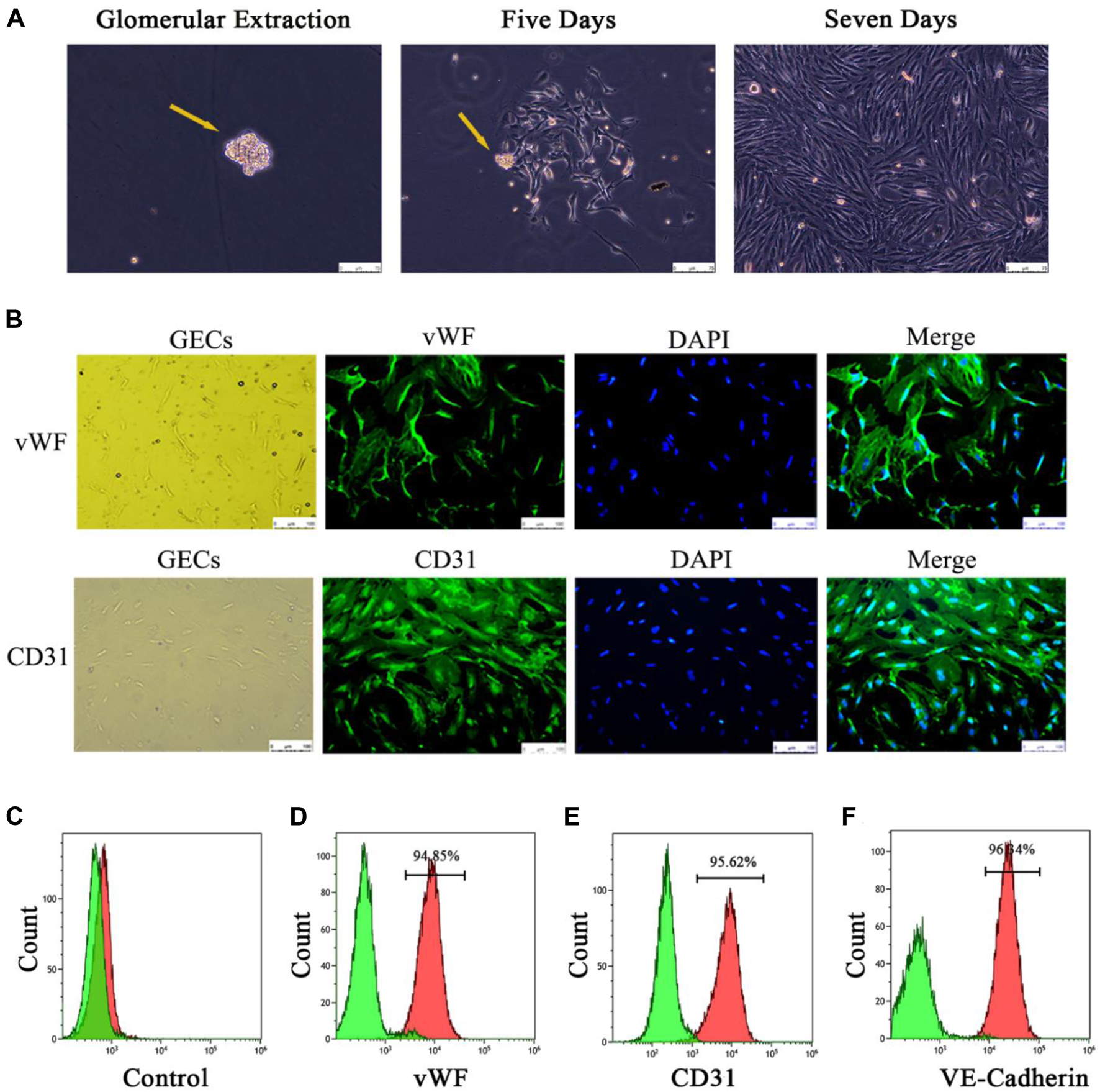 Tissue samples of the kidney cortex were cut into small pieces (1 mm × 1 mm) and digested with 0.1% type IV collagenase (STEMCELL Technologies Inc., Vancouver, Canada) at 37°C for 30 min. The digested kidney cortex was sequentially passed through 80, 100, 200, and 400 mesh sieves and gently ground on the sieves to remove excess tubules and cellular debris. The 400 mesh sieves eventually left only glomeruli. The glomeruli were washed with endothelial cell complete medium, and the suspension was incubated at 37°C with 5% CO2, during which the GECs wrapped around the glomeruli and crawled outwards (Figure 7A). Formal identification was provided by staining for key endothelial cell markers (vWF and CD31; Abcam, Cambridge, MA, United States) and detecting endothelial cell marker proteins (CD31, vWF and VE-calmodulin; Abcam, Cambridge, MA, United States) using flow cytometry.