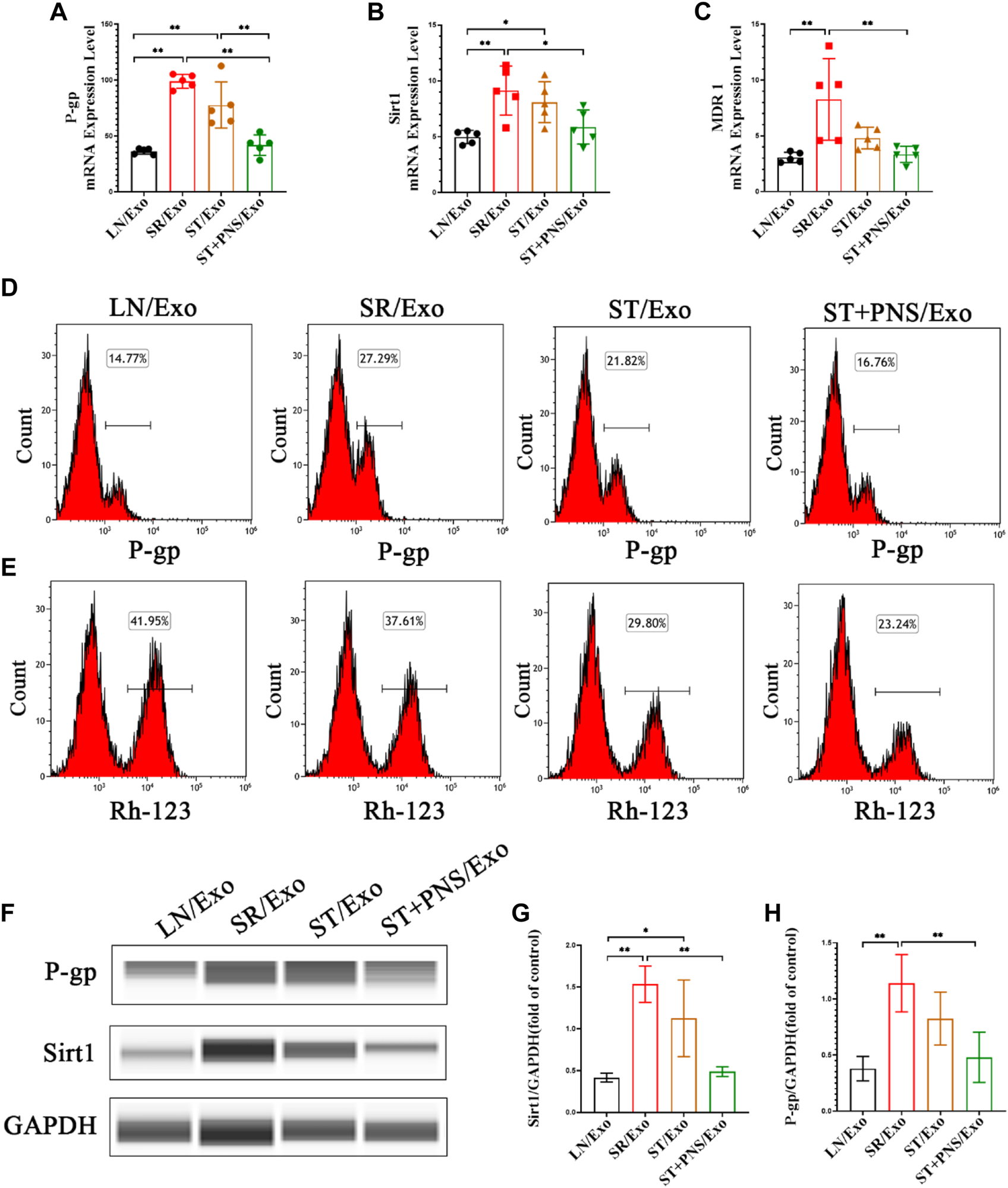 Expression of steroid resistance-related indicators in each group of GECs extracted after different Lyme-Exo interventions. (A–C) Detection of the mRNA expression of Sirt1, MDR1 and P-gp by qRT-PCR. (D,E) Flow cytometry detection of P-gp levels and accumulation of Rh-123 in each group of GECs. (F–H) Sirt1 and P-gp protein levels in GECs were detected by capillary immunoassay. All data are expressed as the mean ± standard deviation from independent groups, *p < 0.05, **p < 0.01.