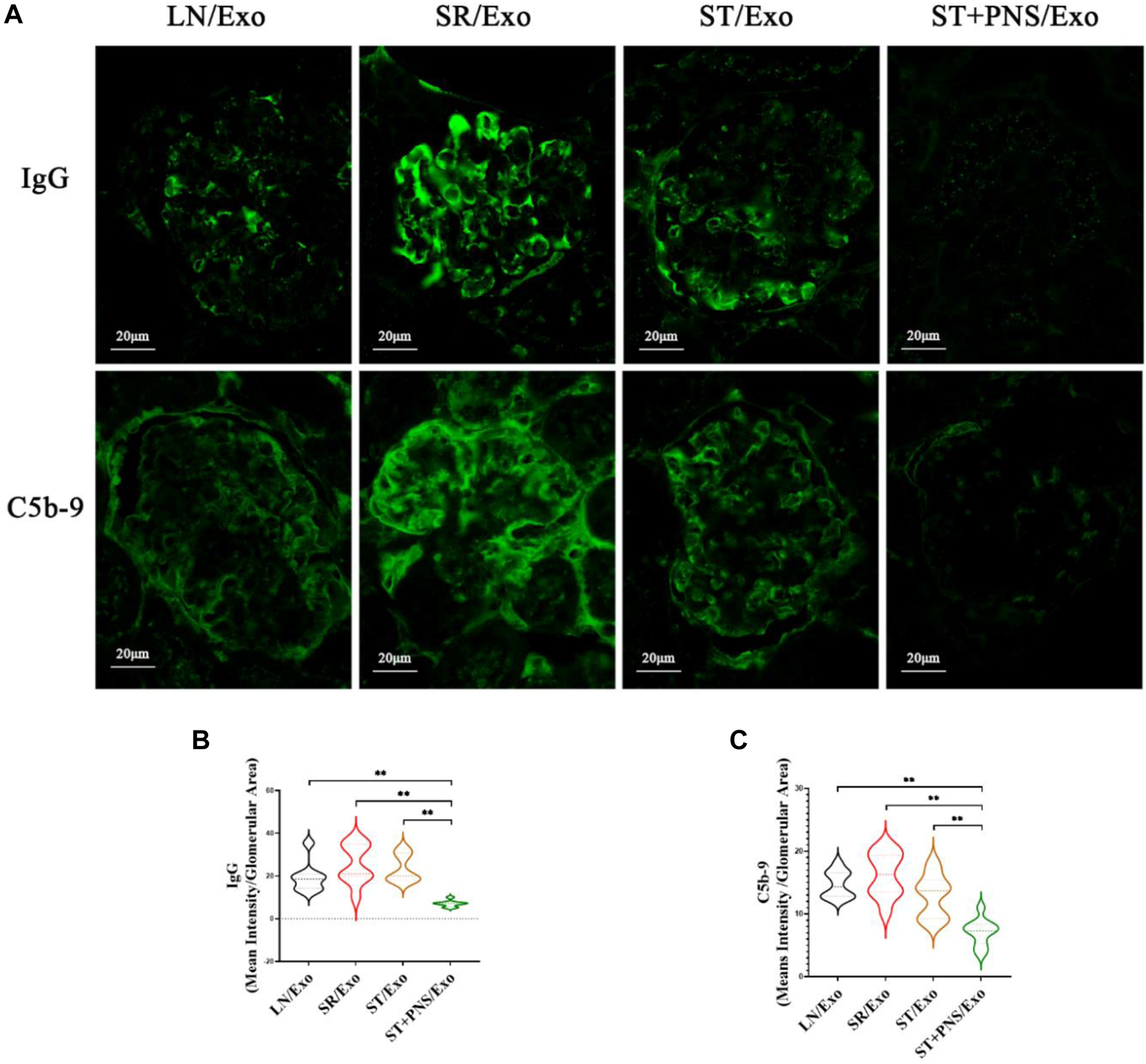 Among the four groups, the glomerular immunofluorescence of mice in the SR/Exo group exhibited stronger immunoglobulin fine-granular deposition of IgG and membrane attack complex C5b-9 along the capillary collaterals (Figure 7A). In contrast, the deposition of IgG and C5b-9 in the glomerular capillary collaterals of LN mice in the ST + PNS/Exo group was significantly attenuated and even lower than that in the ST/Exo group (Figures 7B,C). This finding suggests that PNS/Exos contribute to the amelioration of glomerular immunopathological injury in LN mice.
