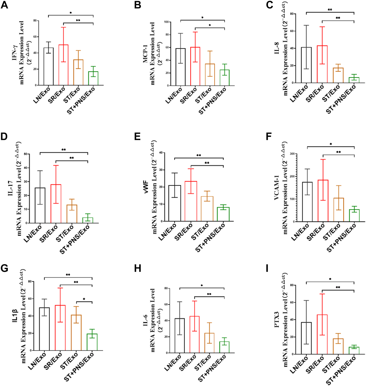 After different exosome interventions, we observed that the mRNA expression levels of various cytokines were regulated in the renal cortex. Such as IFN-γ, MCP-1, IL-8 and IL-17 secreted by activated T cells, (Figures 8A–D), adhesion molecules responding to vascular endothelial injury, such as VCAM-1 and vWF (Figures 8E,F), and various proinflammatory factors, such as IL-1β, IL-6, and PTX3 (Figures 8G–I) in ST/Exo and ST + PNS/Exo groups were decreased to different degrees, but only the ST + PNS/Exo group showed a statistically significant decrease.