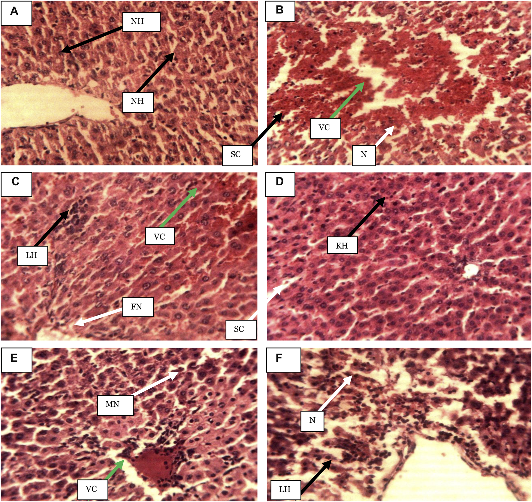 FIGURE 2. (A) Distilled water (1 ml/kg), (B) BDL + Distilled water (1 ml/kg), (C) BDL + Sily (50 mg/kg), (D) BDL + ASE (125 mg/kg), (E) BDL + ASE (250 mg/kg), (F) BDL + ASE (380 mg/kg), NH = Normal hepatocytes, VC = Vascular congestion, MN = Moderate necrosis, SN = Slight necrosis, LH = Lymphocytes hyperplasia, KH = Kupffer cell hyperplasia, ASE = Acacia sieberiana extract.