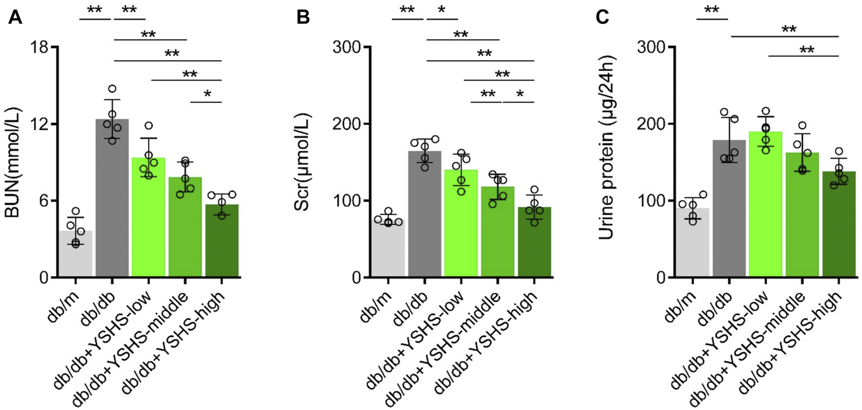 To confirm the ameliorating effect of YSHS on renal function and proteinuria in DN mice, we used the DN model db/db mice as the animal model. The detection results showed that the contents of SCr and BUN in db/db mice at the same age were significantly higher than those in db/m mice at the age of 20 weeks (p < 0.01 db/m group vs. db/db group, Figures 1A,B). The results also showed that the 24-h urine protein content of 20-week-old db/db mice was significantly higher than that of db/m mice (p < 0.01 db/m group vs. db/db group, Figure 1C). The db/db mice showed abnormal renal function and proteinuria, that is, spontaneous DN mice were successfully established.