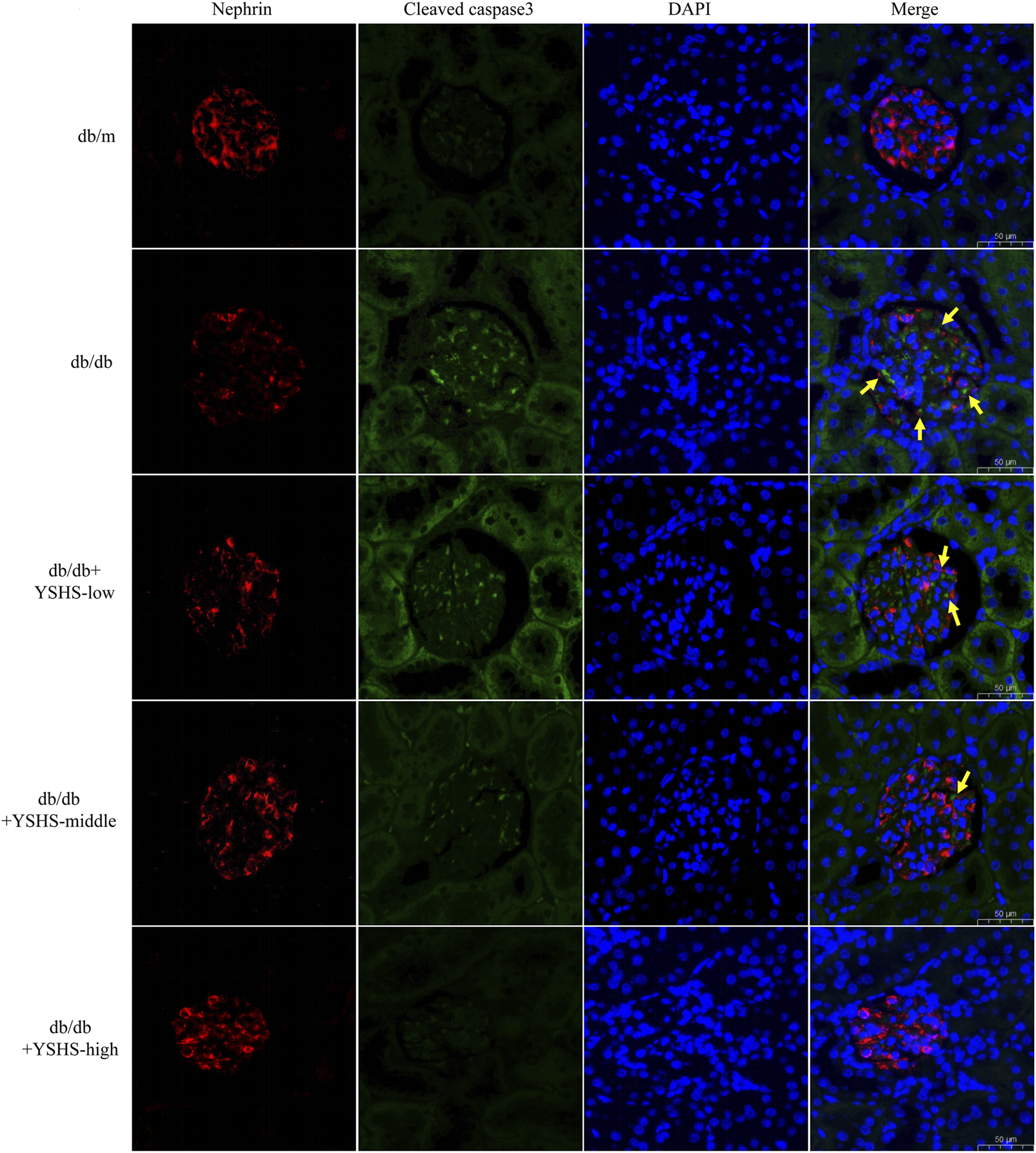 Immunofluorescence detection of the expression level of cleaved caspase-3 in podocytes in the kidney tissue of DN mice. Red indicates the podocyte marker nephrin, green indicates cleaved caspase-3, and yellow arrows indicate cleaved caspase-3 staining sites in nepherin + cells; the size of the scale is 50 μm.