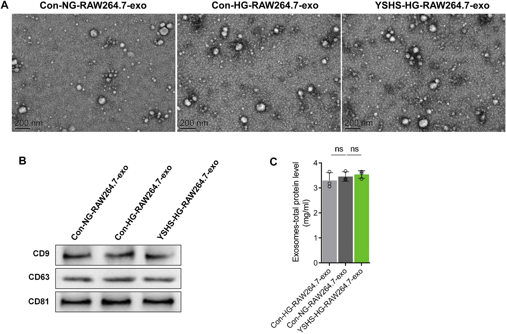 Identification of macrophage exosomes and the effects of YSHS and high-glucose stimulation on macrophage-derived exosome secretion. (A) Images of macrophage-derived exosome morphology taken by transmission electron microscopy (TEM). (B) Measurement of the protein level of CD9, CD63, and CD81 of macrophage-derived exosomes by Western blotting. (C) The protein concentration of macrophage-derived exosomes was detected by the BCA method. Data analysis adopts a one-way ANOVA analysis of variance. SD indicates error bars ns p > 0.05. NG indicates normal glucose (5.5 mM d-glucose), and HG indicates high glucose (30 mM d-glucose). Con-NG-RAW264.7-exo indicates exosomes from macrophage RAW264.7 cells treated with normal glucose and 10% control serum, Con-HG-RAW264.7-exo represents exosomes from macrophage RAW264.7 cells treated with high glucose and 10% control serum, and YSHS-HG-RAW264.7-exo represents exosomes from macrophage RAW264.7 cells treated with high glucose and 10% YSHS-serum.
