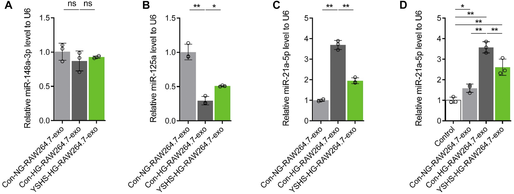 Effect of exosomes secreted by macrophages treated with high glucose and (or) YSHS-serum on the content of miR-21a-5p in podocyte MPC5 cells. (A-C) Effect of medicated serum of YSHS granule on the contents of miR-148a-3p, miR-125a, and miR-21a-5p in macrophage-derived exosomes induced by HG. (D) Measurement of the miR-21a-5p content by qRT-PCR in MPC5 cells with different treatments. Data analysis adopts a one-way analysis of variance. SD indicates error bars. *p < 0.05 and **p < 0.01.