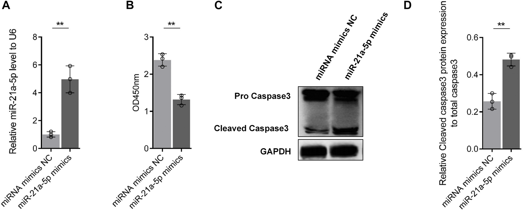 Effect of miR-21a-5p on podocyte injury. (A) Effect of miR-21a-5p mimics transfection on the content of miR-21a-5p in MPC5 cells. (B) Effect of miR-21a-5p mimics transfection on MPC5 cell viability. (C-D) Effect of miR-21a-5p on the cleavage of apoptotic protein caspase-3 in MPC5 cells. Data analysis adopts Student’s t-test. SD indicates error bars. *p < 0.05 and **p < 0.01.