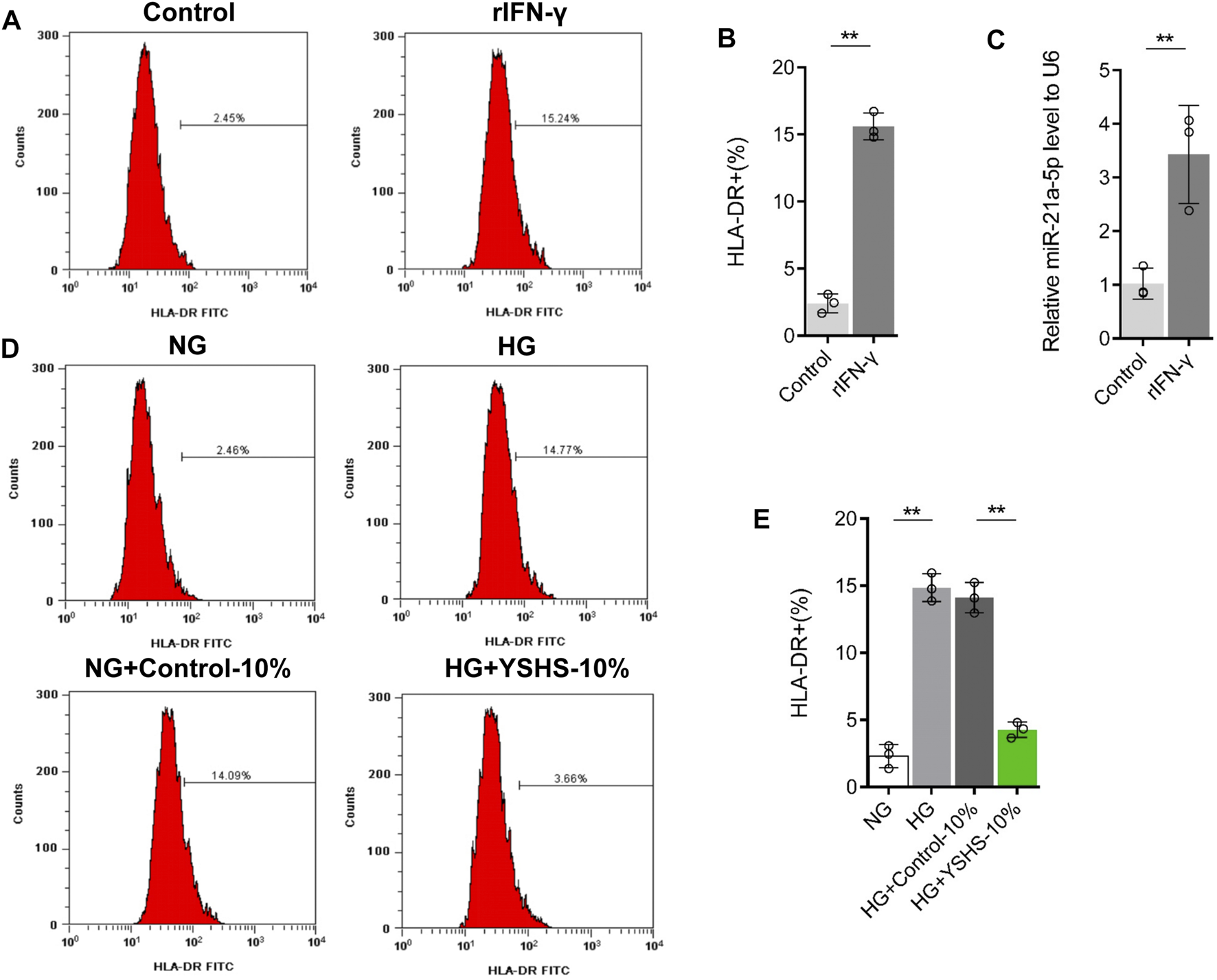 Effect of YSHS on the polarization of M1 macrophages. (A–B) Flow cytometry to detect the expression of HLA-DR in the macrophage treated with or without LPS (100 ng/ml) and recombinant IFN-γ (20 ng/ml) for 24 h. (C) Measurement of the miR-21a-5p content in macrophage-derived exosomes by qRT-PCR. (D–E) Flow cytometry to detect the expression of HLA-DR in macrophages treated with or without YSHS-serum in the presence of NG or HG. Data analysis adopts a Student’s t-test (B–C) or a one-way analysis of variance (E). LPS + rIFN-γ represents that macrophage RAW264.7 cells were treated with LPS (100 ng/ml) and recombinant IFN-γ (20 ng/ml) for 24 h, NG indicates that macrophage RAW264.7 cells were treated with normal glucose, HG represents that macrophage RAW264.7 cells were treated with high glucose, HG + control-serum indicates that macrophage RAW264.7 cells were treated with high glucose and 10% control serum, and HG + YSHS-serum represents that macrophage RAW264.7 cells were treated with high glucose and 10% YSHS-serum. SD indicated error bars. **p < 0.01.