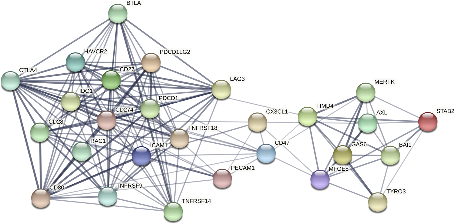 The PPI network of the 15 efferocytosis-related molecules and 12 other immune checkpoint-related molecules with confidence >0.4. The thickness of the line indicates the size of the correlation coefficient.
