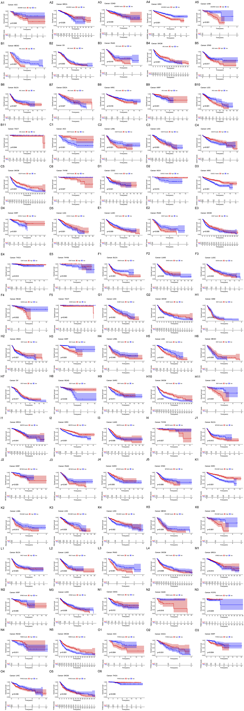 The correlation of the expression of efferocytosis-related molecules with the overall survival (OS) in 33 types of cancers. Kaplan-Meier survival curves were generated for the molecules extracted from the comparison of groups of high (red line) and low (blue line) gene expression. p < 0.05 in the log-rank test. (A1–A5) The expression of ADGRB1 (BAI1) was significantly associated with OS in ACC, BRCA, COAD, KIRC, and UVM. (B1–B11) The expression of Axl was significantly associated with OS in MESO, OV, PAAD, SKCM, STAD, BLCA, ESCA, KIRC, KIRP, LGG, and TGCT. (C1–C6) The expression of CD274 (PD-L1) was significantly associated with OS in ACC, LAML, LGG, LIHC, SKCM, and THYM. (D1–D5) The expression of CX3CL1 was significantly associated with OS in CESC, KICH, KIRC, KIRP, and LGG. (E1–E5) The expression of CD47 was significantly associated with OS in LUSC, PAAD, SKCM, THCA, and THYM. (F1–F5) The expression of Gas6 was significantly associated with OS in BLCA, LUAD, LUSC, READ, and TGCT. (G1–G2) The expression of ICAM1 was significantly associated with OS in LGG and SKCM. (H1–H11) The expression of IDO1 was significantly associated with OS in GBM, HNSC, KIRP, LAML, LGG, MESO, OV, READ, SARC, SKCM, and UVM. (I1–I4) The expression of MerTK was significantly associated with OS in BRCA, KIRC, LUAD, and THYM. (J1–J5) The expression of MFGE8 was significantly associated with OS in BLCA, KIRP, PAAD, SARC, and STAD. (K1–K6) The expression of PECAM1 (CD31) was significantly associated with OS in KIRC, LAML, LGG, LIHC, MESO, and UVM. (L1–L4) The expression of RAC1 was significantly associated with OS in BLCA, LUAD, PAAD, and SKCM. (M1–M3) The expression of STAB2 was significantly associated with OS in BRCA, KIRP, and LUSC. (N1–N5) The expression of TIMD4 was significantly associated with OS in CESC, DLBC, PCPG, READ, and SKCM. (O1–O6) The expression of Tyro3 was significantly associated with OS in ACC, ESCA, KIRP, LIHC, SKCM, and THCA.
