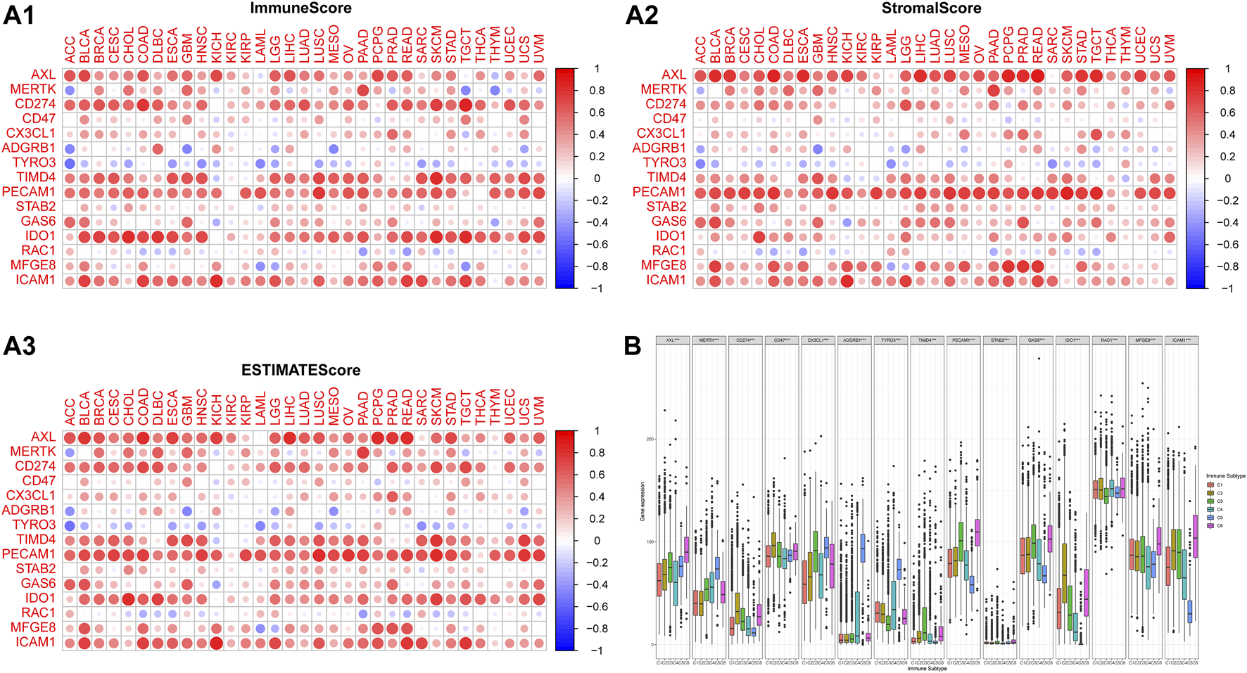 The correlations of the expressions of efferocytosis-related molecules with the microenvironment and immune subtype in 33 types of cancers. The corrplot package was used to assess the association of molecules with the immune score, stromal score, and ESTIMATE score. The color of a node reflects the log(FC) value of the Z score of gene expression, and the size of the node indicates the number of interacting proteins with the designated protein. (A1) The correlations of the expressions of efferocytosis-related molecules with the immune score. (A2) The correlations of the expressions of efferocytosis-related molecules with the stromal score. (A3) The correlations of the expressions of efferocytosis-related molecules with the ESTIMATE score. (B) Distribution of efferocytosis-related molecules in immune subtypes C1 (wound healing), C2 (IFN-γ-dominant), C3 (inflammatory), C4 (lymphocyte depleted), C5 (inflammatory) and C6 (TGF-β-dominant).
