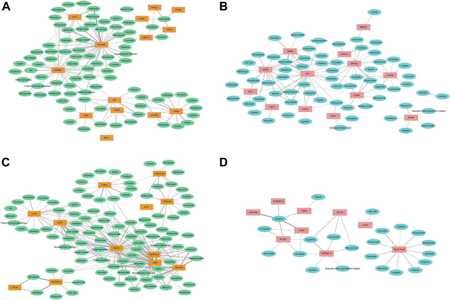 The correlations of the expressions of efferocytosis and immune checkpoint related molecules with sensitivity of the cancer cells to the 126 types of anti-cancer drugs. The thickness of the line indicates the size of the correlation coefficient. (A). The correlations of the enhanced expressions of 14 efferocytosis-related molecules with increased sensitivity to anti-cancer drugs. (B) The correlations of the enhanced expresssions of 14 efferocytosis-related molecules with decreased sensitivity to anti-cancer drugs. (C) The correlations of the enhanced expressions of 12 immune checkpoint-related molecules with increased sensitivity to anti-cancer drugs. (D) The correlations of the enhanced expressions of 9 immune checkpoint-related molecules with decreased sensitivity to anti-cancer drugs.