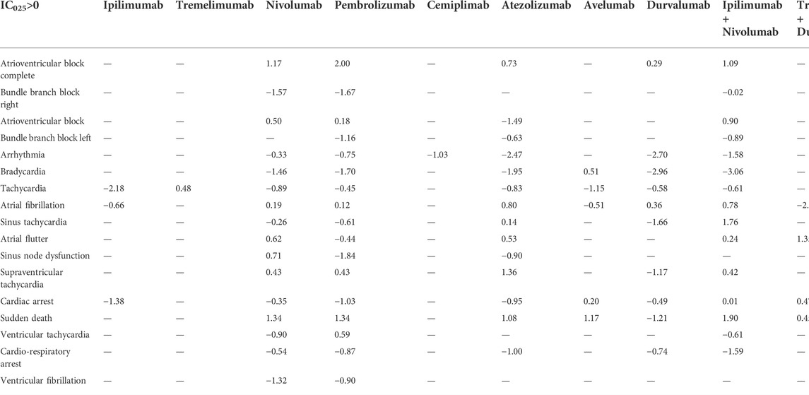 Atrioventricular block complete, atrial fibrillation and sudden death were three overlapping PTs. Among these, sudden death was the most frequent PT, also detected as the second strongest signal (IC 025 = 1.90). Both atrioventricular block complete and atrial fibrillation were found significantly associated with nivolumab, pembrolizumab, atezolizumab, avelumab, and ipilimumab plus nivolumab, with atrioventricular block complete detected as the strongest signal in pembrolizumab (IC 025 = 2.00).