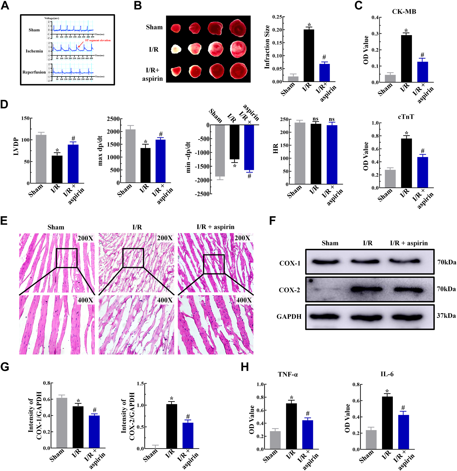 Aspirin inhibits myocardial inflammation and alleviates cardiac dysfunction in response to I/R injury. (A) Representative electrocardiogram shows the successful establishment of myocardial I/R injury model (n = 5 per group). The red arrows represent changes in the ST segment. (B) Representative images show TTC staining of the myocardium from rats (n = 5 per group) belonging to the sham, I/R, and I/R + 50 mg/kg aspirin groups. The infarct size quantification of the 3 groups of rats is also shown. (C) ELISA assay results show the serum levels of creatine kinase-MB (CK-MB) and cardiac troponin T (cTnT) in the sham, I/R, and I/R + aspirin group rats (n = 5 per group). (D) Laggendorff in vitro cardiac perfusion results show the left ventricular developed pressure (LVDP), maximum and minimum rates of pressure development (max dP/dt and min dP/dt), and heart rate (HR) in the sham, I/R, and I/R + aspirin group rats (n = 5 per group). (E) Representative H&E staining images (×200 and ×400) show the histological details of the myocardium from the sham, I/R, and I/R + aspirin group rats (n = 5 per group). (F,G) Representative immunoblots and quantification of the expression levels of COX-1 and COX-2 in the sham, I/R, and I/R + aspirin group rats (n = 5 per group). (H) ELISA results show the tumor necrosis factor-α (TNF-α) and interleukin-6 (IL-6) level in the myocardial tissues of the sham, I/R, and I/R + aspirin group rats (n = 5 per group). The tissues were harvested 2 h post-reperfusion. The data are represented as means ± SD; *p < 0.05 vs. the sham group; #p < 0.05 vs. the I/R group.