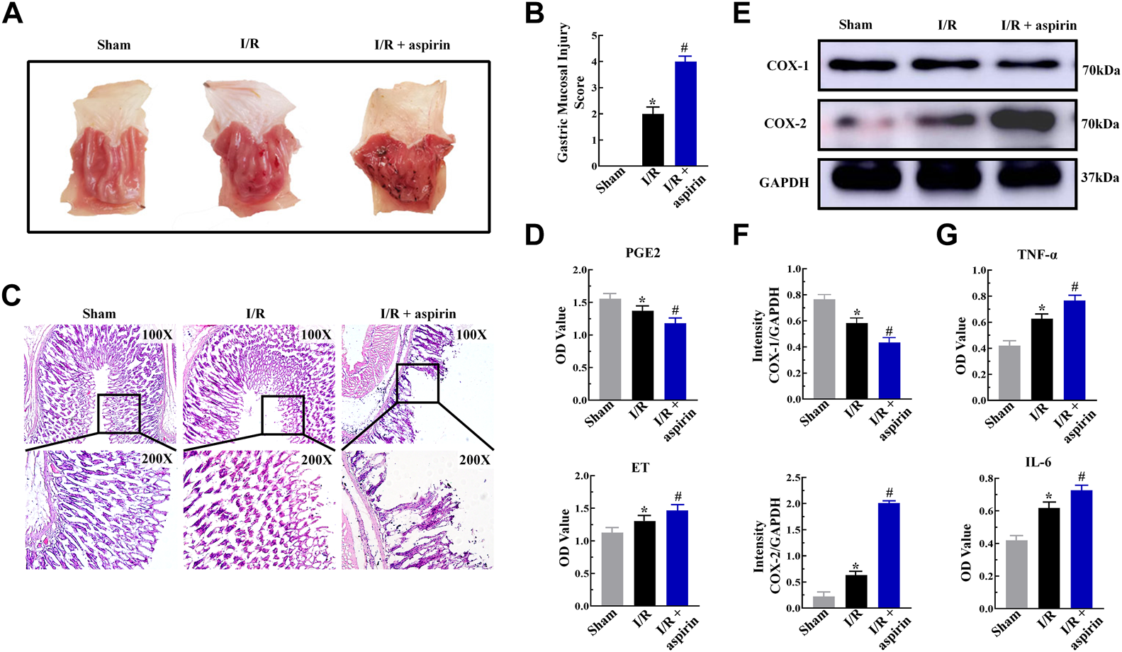 Aspirin aggravates gastric mucosal injury by inducing inflammation. (A) Representative images of the harvested stomach specimens from the sham, I/R, and I/R + 50 mg/kg aspirin group rats (n = 5 per group). (B) Byron gastric mucosal injury scores in the sham, I/R, and I/R + aspirin group rats (n = 5 per group). The scoring criteria are shown in Table 1. (C) Representative images (×100 and ×200) of the H&E-staining gastric mucosal tissue sections from the sham, I/R, and I/R + aspirin group rats (n = 5 per group). (D) ELISA assay results show the levels of prostaglandin E2 (PGE2) and endothelin (ET) in the gastric tissues of the sham, I/R, and I/R + aspirin group rats (n = 5). (E,F) Representative immunoblots and quantification analysis of COX-1 and COX-2 protein levels in the gastric tissues of the sham, I/R, and I/R + aspirin group rats (n = 5). (G) ELISA assay results show the levels of tumor necrosis factor-α (TNF-α) and interleukin-6 (IL-6) in the gastric tissues of the sham, I/R, and I/R + aspirin group rats (n = 5). The data are represented as means ± SD; *p < 0.05 vs. the sham group; #p < 0.05 vs. the I/R group.