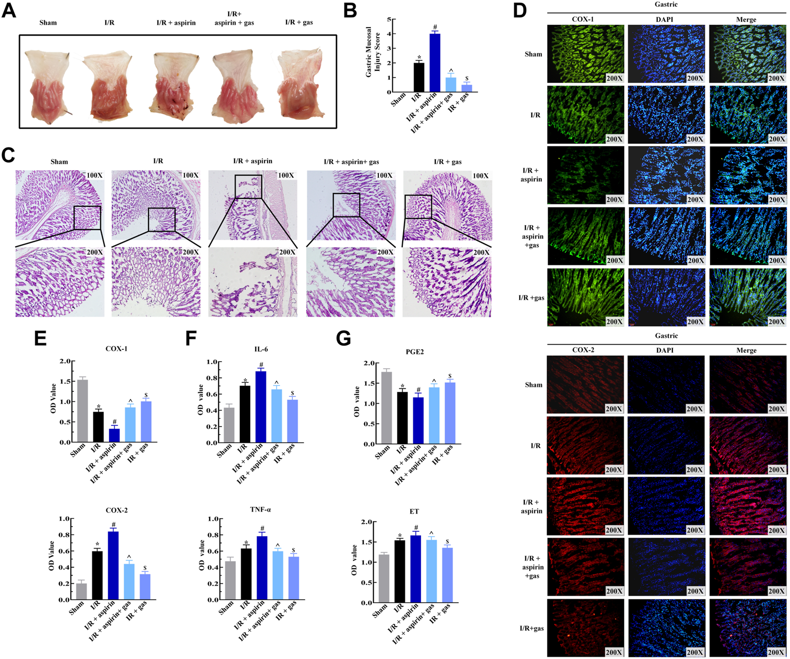 Gasrtodin alleviates dual gastric mucosal injury by suppressing inflammation. (A) Representative images of the harvest stomach specimens from the sham, I/R, I/R + aspirin, I/R + 50 mg/kg aspirin + 200 mg/kg gastrodin group, and I/R + 200 mg/kg gastrodin group rats (n = 5 per group). (B) Byron gastric mucosa injury scores of the sham, I/R, I/R + aspirin, I/R + aspirin + gastrodin group, and I/R + gastrodin group rats (n = 5 per group). The scoring criteria are shown in Table 1. (C) Representative images (×100 and ×200) of the H&E-staining gastric tissue sections from the sham, I/R, I/R + aspirin, I/R + aspirin + gastrodin group, and I/R + gastrodin group rats (n = 5 per group). (D) Representative immunofluorescence staining images (×200) show the COX-1 and COX-2 expression levels in the gastric tissues of the sham, I/R, I/R + aspirin, I/R + aspirin + gastrodin group, and I/R + gastrodin group rats (n = 5 per group). The green denotes COX-1, red denotes COX-2, and blue denotes the nucleus. (E–G) ELISA assay results show the levels of cyclooxygenase-1 (COX-1), cyclooxygenase-2 (COX-2), tumor necrosis factor-α (TNF-α), interleukin-6 (IL-6), prostaglandin E2 (PGE2) and endothelin (ET) in the gastric tissues of the sham, I/R, I/R + aspirin, I/R + aspirin + gastrodin group,and I/R + gastrodin group rats (n = 5 per group). The data are represented as means ± SD; *p < 0.05 vs. the sham group; #p < 0.05 vs. the I/R group; ^p < 0.05 vs. the I/R + aspirin group; &p < 0.05 vs. the I/R + aspirin + gastrodin group.