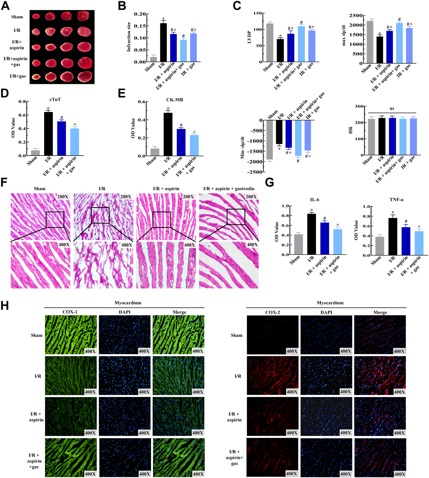 Combined therapy with aspirin and gastrodin alleviates cardiac dysfunction induced by myocardial I/R. (A,B) Representative TTC staining images of the myocardium from the sham, I/R, I/R + aspirin, I/R + aspirin + gastrodin group, and I/R + gastrodin group rats (n = 5 per group). Quantification of the infarct size based on TTC staining of the myocardium from the sham, I/R, I/R + aspirin, I/R + aspirin + gastrodin group, and I/R + gastrodin group rats (n = 5 per group) is also shown. (C) Laggendorff in vitro cardiac perfusion measurements show the left ventricular developed pressure (LVDP), maximum and minimum rates of pressure development (dP/dt max and dP/dt min) and heart rate (HR) in the sham, I/R, I/R + aspirin, I/R + aspirin + gastrodin group, and I/R + gastrodin group rats (n = 5 per group). (D,E) ELISA assay results show the serum creatine kinase-MB (CK-MB) and cardiac troponin T (cTnT) levels in the sham, I/R, I/R + aspirin, and I/R + aspirin + gastrodin group rats (n = 5 per group). (F) Representative H&E-staining images (×200 and ×400) show the myocardial histology and morphological characteristics in the sham, I/R, I/R + aspirin, and I/R + aspirin + gastrodin group rats (n = 5 per group). (G) ELISA assay results show the tumor necrosis factor-α (TNF-α) and interleukin-6 (IL-6) levels in the myocardial tissues of the sham, I/R, I/R + aspirin, and I/R + aspirin + gastrodin group rats (n = 5 per group). The samples for ELISA were harvested 2 h post-reperfusion. (H) Representative immunofluorescence staining images (×400) show the COX-1 and COX-2 expression levels in the heart tissue of the sham, I/R, I/R + aspirin, and I/R + aspirin + gastrodin group rats (n = 5 per group). Green represents COX-1; red represents COX-2; blue represents the nucleus. The data are represented as means ± SD; *p < 0.05 vs. the sham group, #p < 0.05 vs. the I/R group, ^p < 0.05 vs. the I/R + aspirin + gastrodin group.