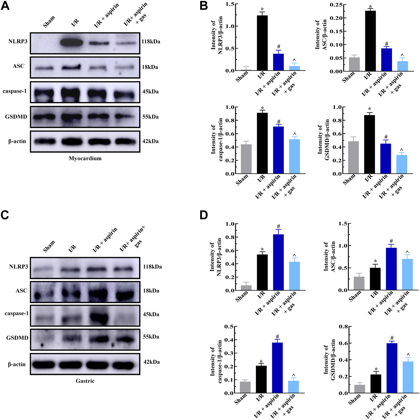 Combined treatment with aspirin and gastrodin protects against cardiac and gastric mucosal injury by suppressing pyroptosis. (A,B) Representative immunoblots and quantification analysis of the NLRP3, ASC, caspase-1, and GSDMD protein levels in the myocardium of the sham, I/R, I/R + aspirin, and I/R + aspirin + gastrodin group rats (n = 5 per group). (C,D) Representative immunoblots and the quantification analysis of the NLRP3, ASC, caspase-1, and GSDMD protein expression levels in the gastric tissues of the sham, I/R, I/R + aspirin, and I/R + aspirin + gastrodin group rats (n = 5 per group). The data are represented as means ± SD; *p < 0.05 vs. the sham group; #p < 0.05 vs. the I/R group; ^p < 0.05 vs. the I/R + aspirin group.