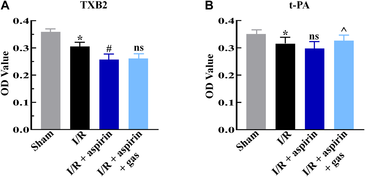 Furthermore, we discussed the effects of combined treatment with aspirin and gastrodin on anti-thrombotic function of aspirin by estimating the serum levels of thromboxane B2 (TXB2) and tissue-type plasminogen activator (t-PA) levels. The serum TXB2 level was significantly down-regulated (p < 0.05), while t-PA level was not altered in the individual aspirin treatment compared to without aspirin treatment in myocardial I/R (p > 0.05) (Figures 6A,B). However, the expression level of TXB2 in combination of aspirin and gastrodin treatment was similar to those in the individual aspirin treatment (p > 0.05) (Figures 6A,B); meanwhile, increased t-PA expression level was revealed in combination of aspirin and gastrodin treatment compared with the individual aspirin treatment (p < 0.05) (Figures 6A,B). This demonstrated that gastrodin did not inhibit the anti-thrombotic effects of aspirin.