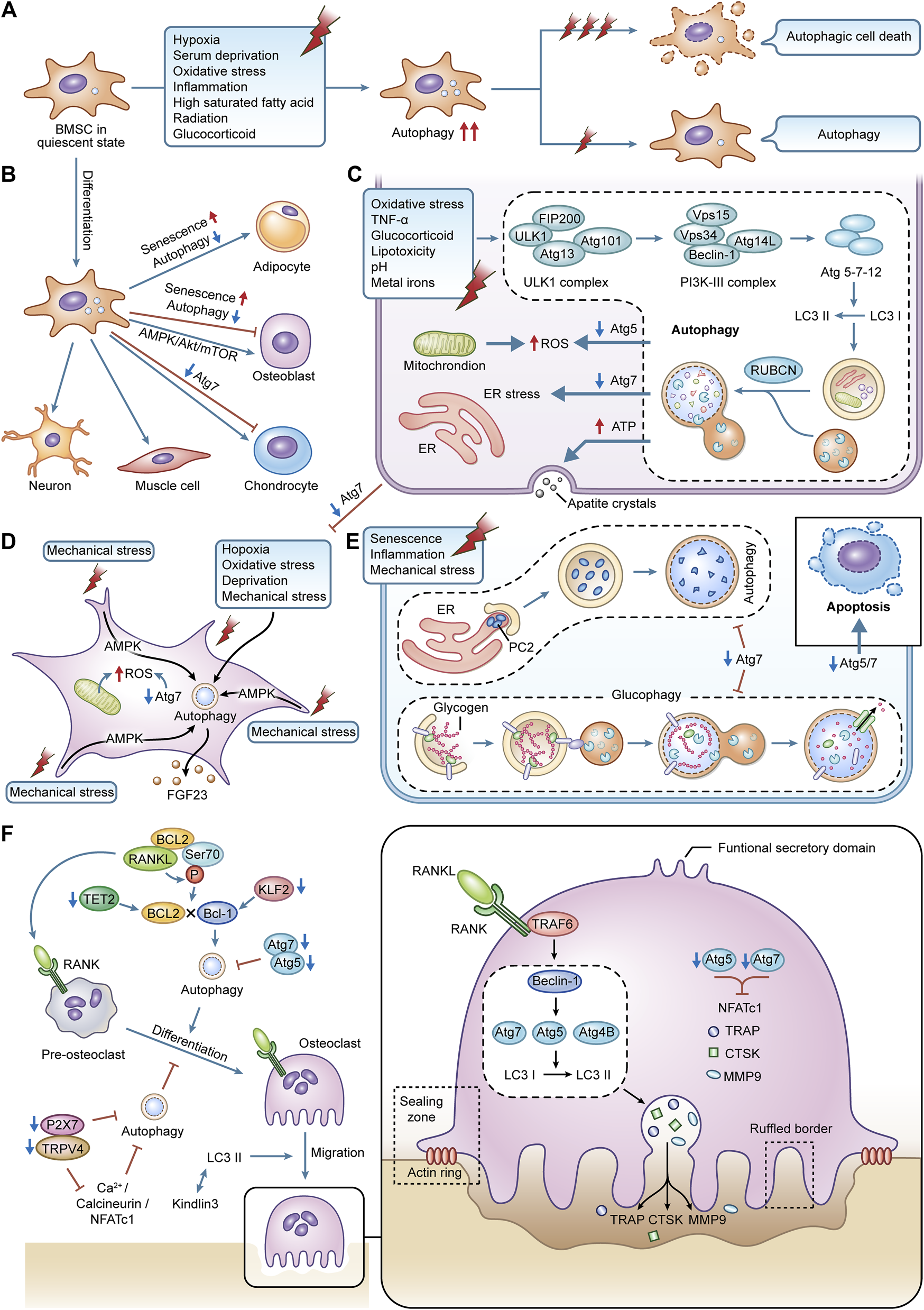 The effects of autophagy in various bone cell. (A) autophagy in BMSCs is activated during cellular differentiation, responding to external stress. (B) the specialized differentiation process in BMSCs is modified by autophagy. (C) autophagy in osteoblasts is activated caused by the stimulation of external stress. It can maintain redox balance within osteoblasts and affect the cellular mineralization and differentiation process. (D) terminally differentiated osteocytes can maintain lifespan and adapt to harsh environments via autophagy. The interaction between autophagy and mechanical stress is critical for the functions of osteocytes. (E) autophagy is an essential part of BMSCs differentiating into chondrocytes. Autophagy can regulate the secretion of type II collagen. Glycophagy can supply energy for chondrocytes. (F) the differentiation, migration, and bone resorption functions of osteoclasts are supported by autophagy.