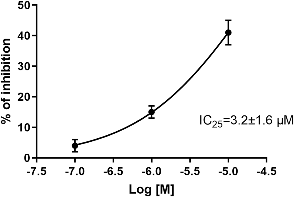 Evaluation of CPL5000036 effects on the cardiovascular system was undertaken in a series of dedicated experiments. An hERG in vitro assay was employed to evaluate the arrhythmic potential using a manual-clamp method in a whole-cell configuration. CPL500036 induced a concentration-dependent inhibition of hERG tail current with an IC25 of 3.2 μM ± 1.6 μM (Figure 2).