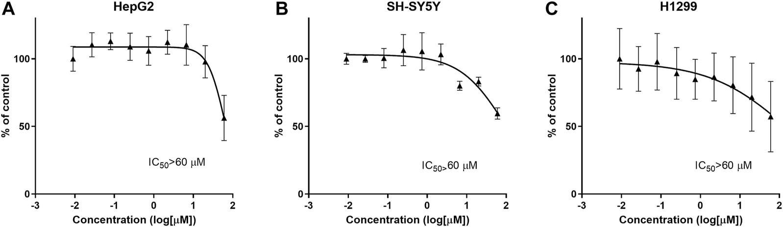 CPL500036 does not induce cytotoxic effects at ≤ 60 μM in HepG2 (A), SH-SY5Y (B), H1299, and (C) cells. Cells were treated 72 h before the MTT assay. Data are the mean ± SD (n = 3).