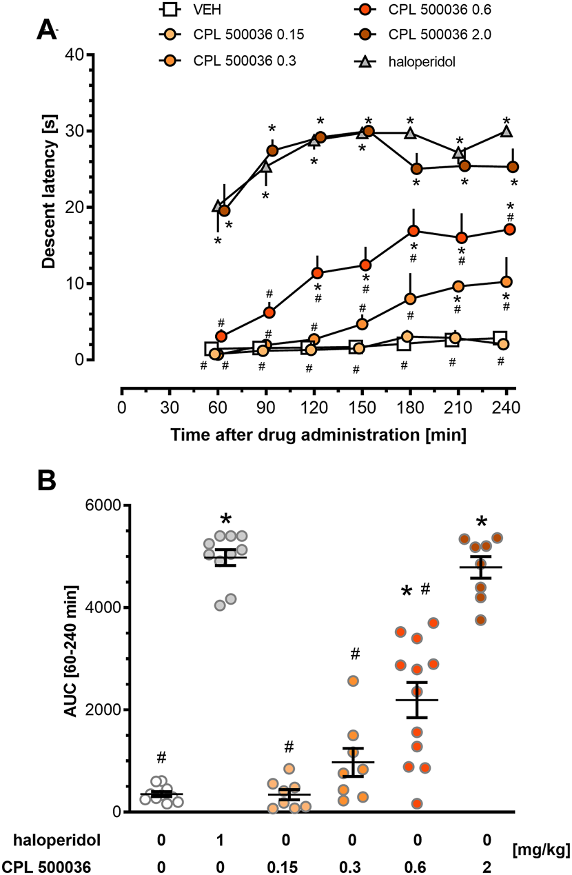 Sprague–Dawley rats (∼300 g; Charles River Laboratories, Wilmington, MA, United States) (n = 8–12/group) were treated (p.o.) with vehicle or CPL500036 (0.15 mg/kg, 0.3 mg/kg, 0.6 mg/kg or 2 mg/kg). As a positive control causing catalepsy, haloperidol (1 mg/kg, i.p.) was employed. One hour following drug administration, catalepsy (prolonged maintenance of an externally imposed abnormal posture) was assessed using the bar test as described by Ionova and Severtsev (Ionov and Severtsev, 2012). Testing was accomplished by placing each rat in an upright position with his forepaws resting on a horizontal bar (0.9 cm in diameter) suspended in a wooden frame 7.5 cm above the cage floor. The rat was allowed to keep his forepaws on the bar for a measurement lasting for 30 s. The latency to remove both forepaws from the bar was measured with a hand-held stopwatch. The test was repeated for each rat every 30 min up to 240 min. Rats were returned to their home cages between tests. Each rat was tested twice, at an interval of 1 week.