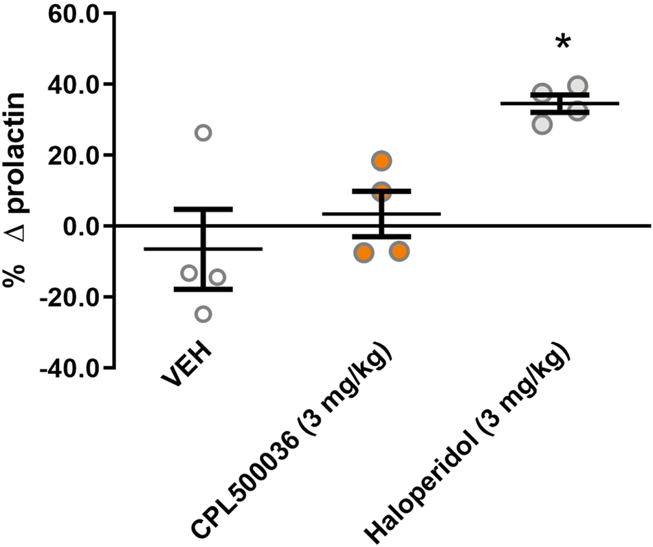 Four male Sprague–Dawley rats (∼10 weeks; Mossakowski Medical Research Institute, Polish Academy of Sciences, Warsaw, Poland), underwent gavage with CPL500036 (3 mg/kg), haloperidol (3 mg/kg; as a positive control) or vehicle. Rats were fasted for 16 h before administration. Blood samples from the tail vein were collected immediately before and 2 h after administration. Plasma was obtained by centrifugation (1,600 × g, 20 min, 4°C) of blood samples collected on K2EDTA, and was stored at −80°C until analyses. The prolactin concentration in plasma samples was determined using the Prolactin (rat) EIA kit (Bertin Rockville, MD, United States) according to the manufacturer’s protocol. The prolactin concentration difference was assessed as follows: