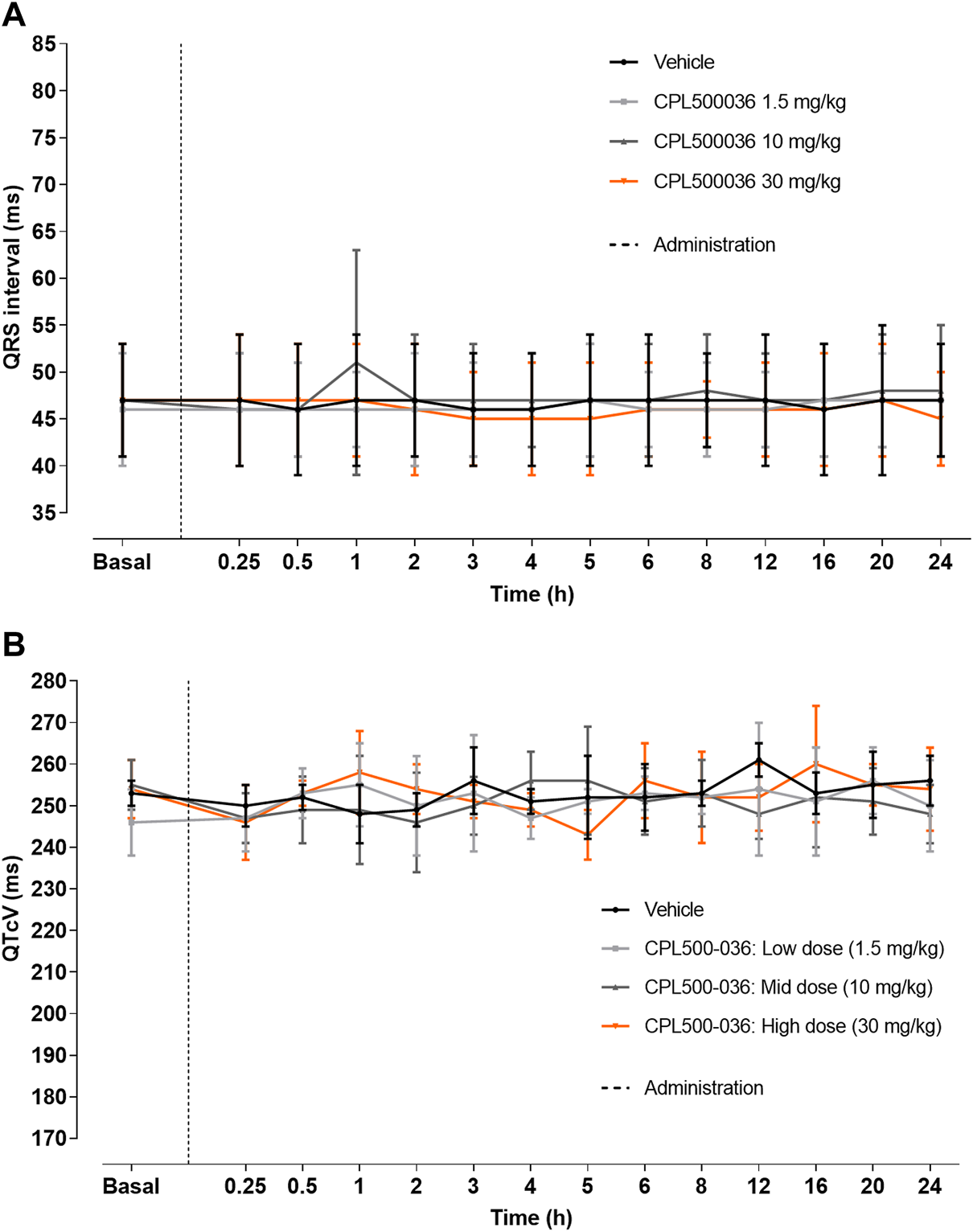 Four male Beagle dogs who had been implanted previously with telemetry transmitter devices (Data Sciences, Saint Paul, MN, United States) were used. The number of animals corresponds to the standard approach used for such studies (Smith et al., 2002; Authier et al., 2020) and includes the accepted study sensitivity and ethics for use of nonrodent species (ICH S7A Safety Pharmacology Studies for Human Pharmaceuticals, 2001; Smith et al., 2002; Authier et al., 2020). The study consisted of four acquisition sessions using a crossover design with dosing intervals of ≥ 48 h. In each experimental session, each dog received (via oral gavage) a different treatment: either vehicle or CPL500036 (1.5 mg/kg, 10 mg/kg or 30 mg/kg). Cardiovascular safety was assessed on arterial blood pressure (systolic, diastolic and mean), heart rate (HR) and electrocardiography (RR interval, PR interval, QRS duration, uncorrected QT and corrected QT (QTc) for heart rate using van de Water correction) acquired continuously for ≥ 2 h before dosing, and for ≥ 24 h post-dose. All parameters were evaluated before and at 13-time points after treatment (15 min, 30 min as well as 1 h, 2 h, 3 h, 4 h, 5 h, 6 h, 8 h,12 h, 16 h, 20 h, and 24 h after dosing).