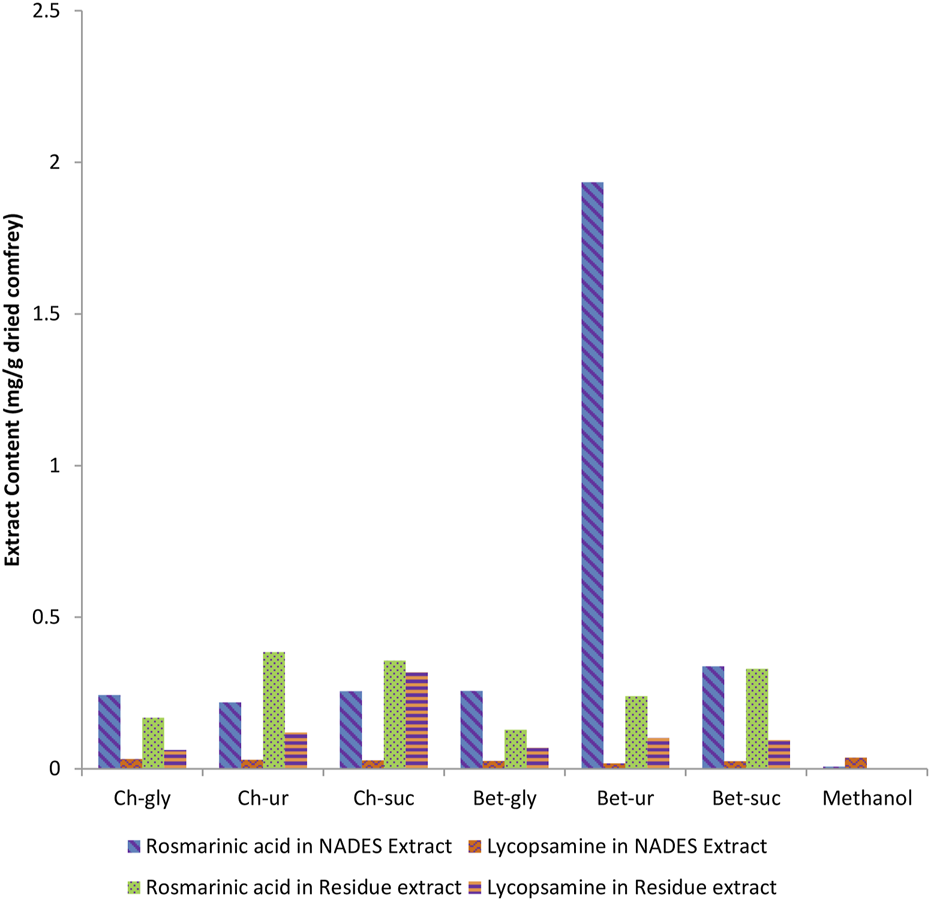 FIGURE 2. Comparison of rosmarinic acid and lycopsamine contents obtained by extraction of comfrey leaves in different NADES. The residue was further re-extracted using methanol to assess the contents of the bioactive metabolites.