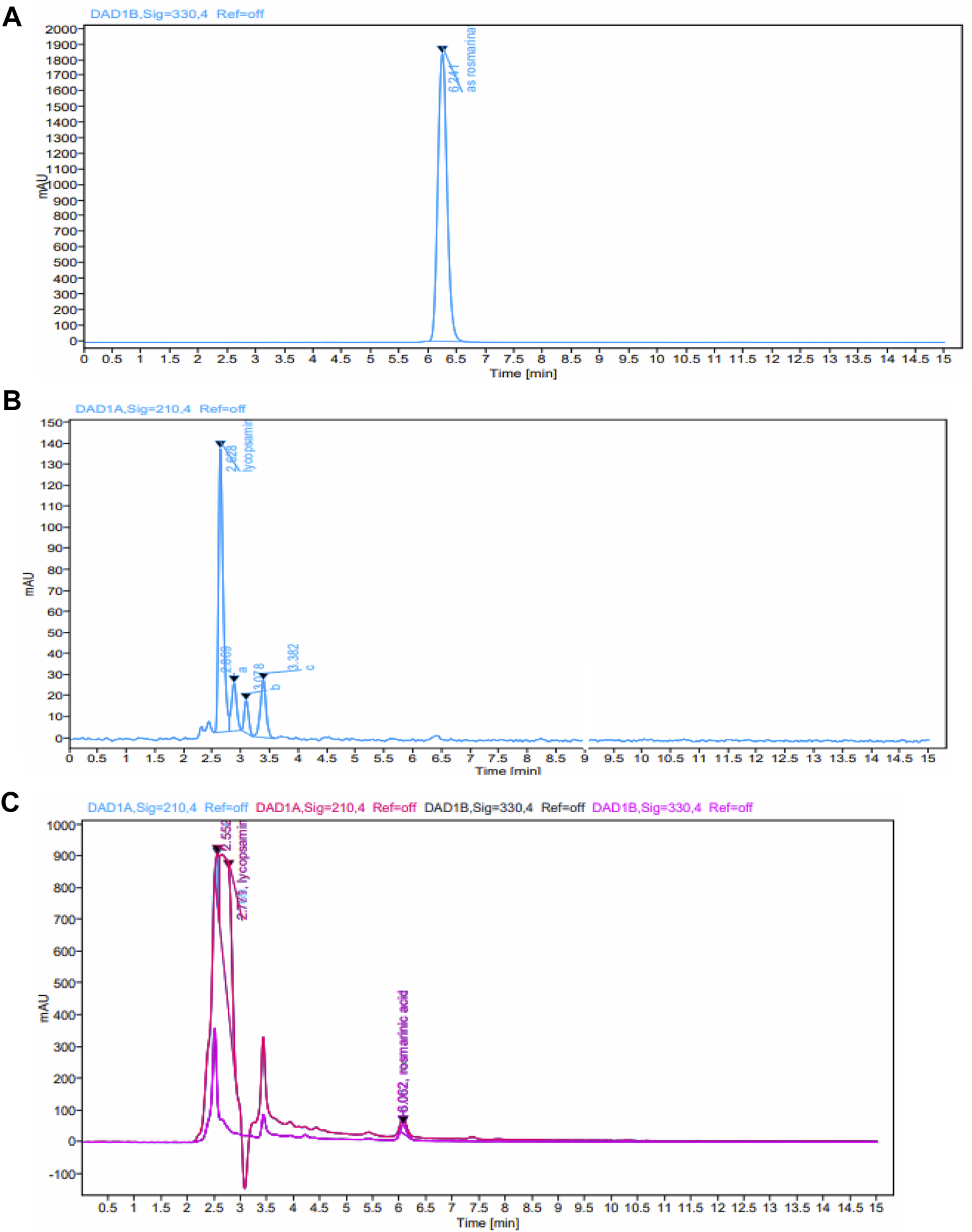 FIGURE 3. HPLC chromatograms of the standard metabolites (A) rosmarinic acid (B) lycopsamine, and (C) extracts obtained by ultrasound assisted extraction of comfrey leaves.