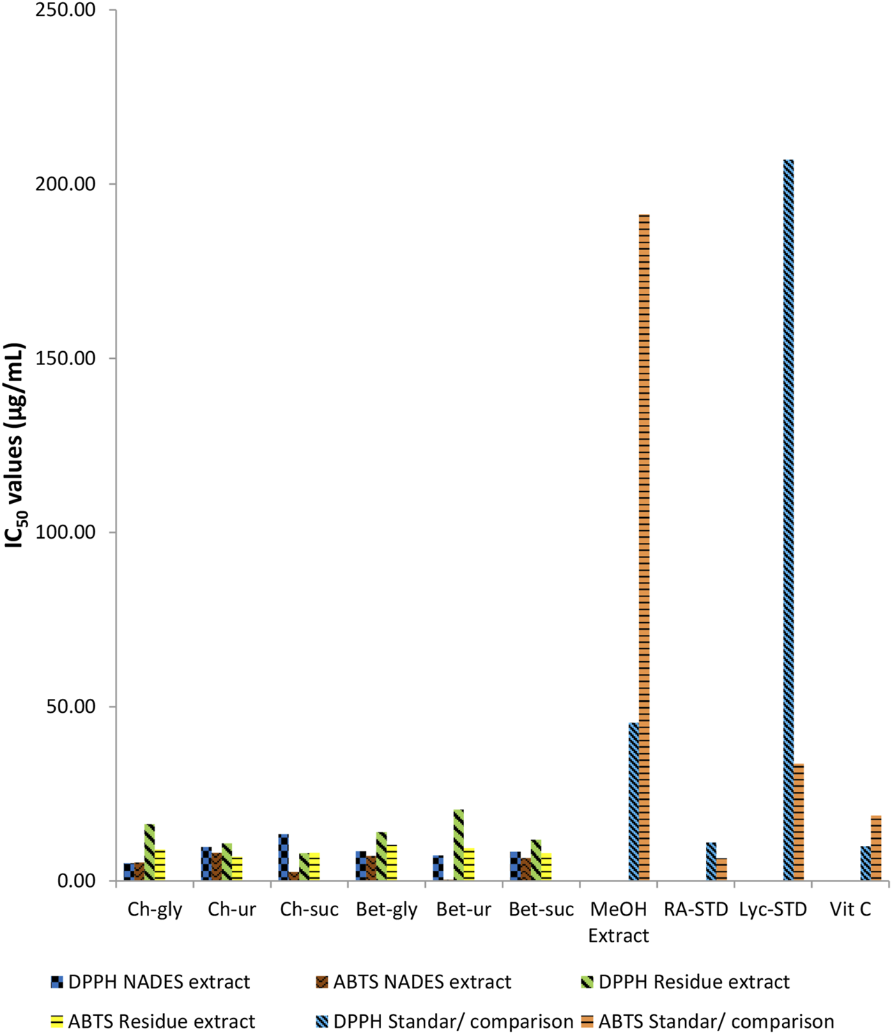 The chemical antioxidant profile of comfrey extracted by different NADES are shown in Figure 4. For comparison, the antioxidant profile of methanol extract of comfrey and standards were also determined. In general, all NADES extracts showed significantly higher antioxidant profile by DPPH and ABTS assays when compared with methanol extract. It was also worth noting that the antioxidant profile of NADES extracts were comparable to those of standards rosmarinic acid, lycopsamine, vitamin C in both assays. Comfrey extracted by betaine-urea showed the highest ABTS scavenging chemical profile (IC50 0.33 μg/mL), whereas its chemical profile by DPPH reagent was the second strongest (IC50 7.36 μg/mL) after extract derived from choline chloride-glycerol.