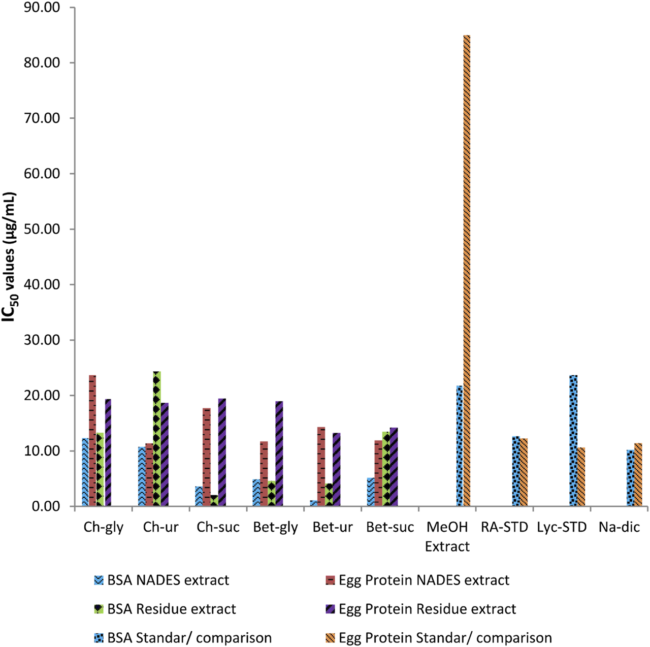 FIGURE 5. Comparison of anti-inflammatory activities of comfrey leaf extracts by different NADES and methanol, and those of standard metabolites.