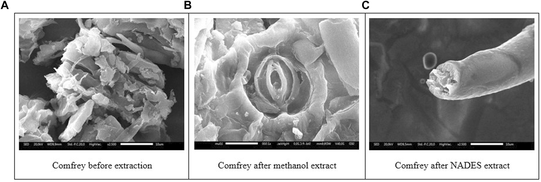 Scanning electron micrographs of comfrey leaves before extraction (A), after extraction in methanol (B), and NADES (C).
