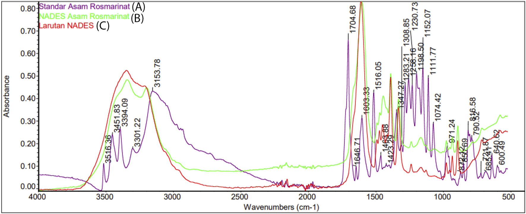 FTIR spectra of (A) standard rosmarinic acid (B) rosmarinic acid in NADES (betaine-urea), and (C) NADES (betaine-urea).