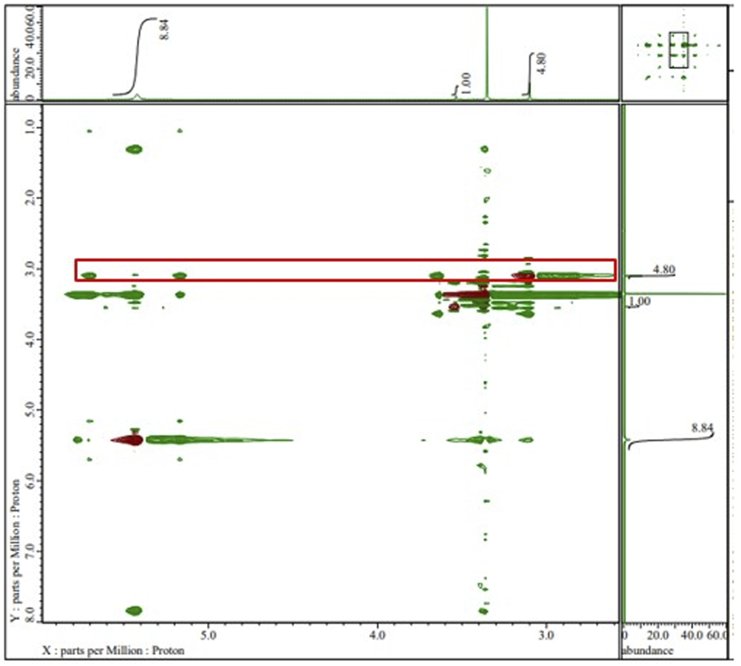 The FTIR absorption spectrum was used to observed structural changes of rosmarinic acid due to solvation in NADES (Figure 7). For this purpose, The FTIR spectra of rosmarinic acid, NADES (betaine-urea), and rosmarinic acid in NADES were compared. FTIR spectra of standard rosmarinic acid in NADES and NADES (betaine-urea) showed characteristic hydroxyl peaks in the 3,000–3,500 cm−1 region. In addition, the solubility of rosmarinic acid in NADES solution was seen at a low intensity peaks in the 2,500–3,000 cm−1 region. The peaks in the 1,000 cm−1 region indicated the hydrogen bonds formed between the hydroxyl and carbonyl groups. This shows that hydrogen bonding plays an important role in the high dissolution of phytochemical metabolites in NADES. The displacement of OH group signals in 1H NMR proton spectra confirmed the establishment of hydrogen bonds, as shown in Figure 8. In the 1H–1H NOESY spectra (Figure 9), it was observed the presence of the spatial heteromolecular interaction between water molecules and the OH groups of the NADES components, supporting the establishment of hydrogen bonds between them.