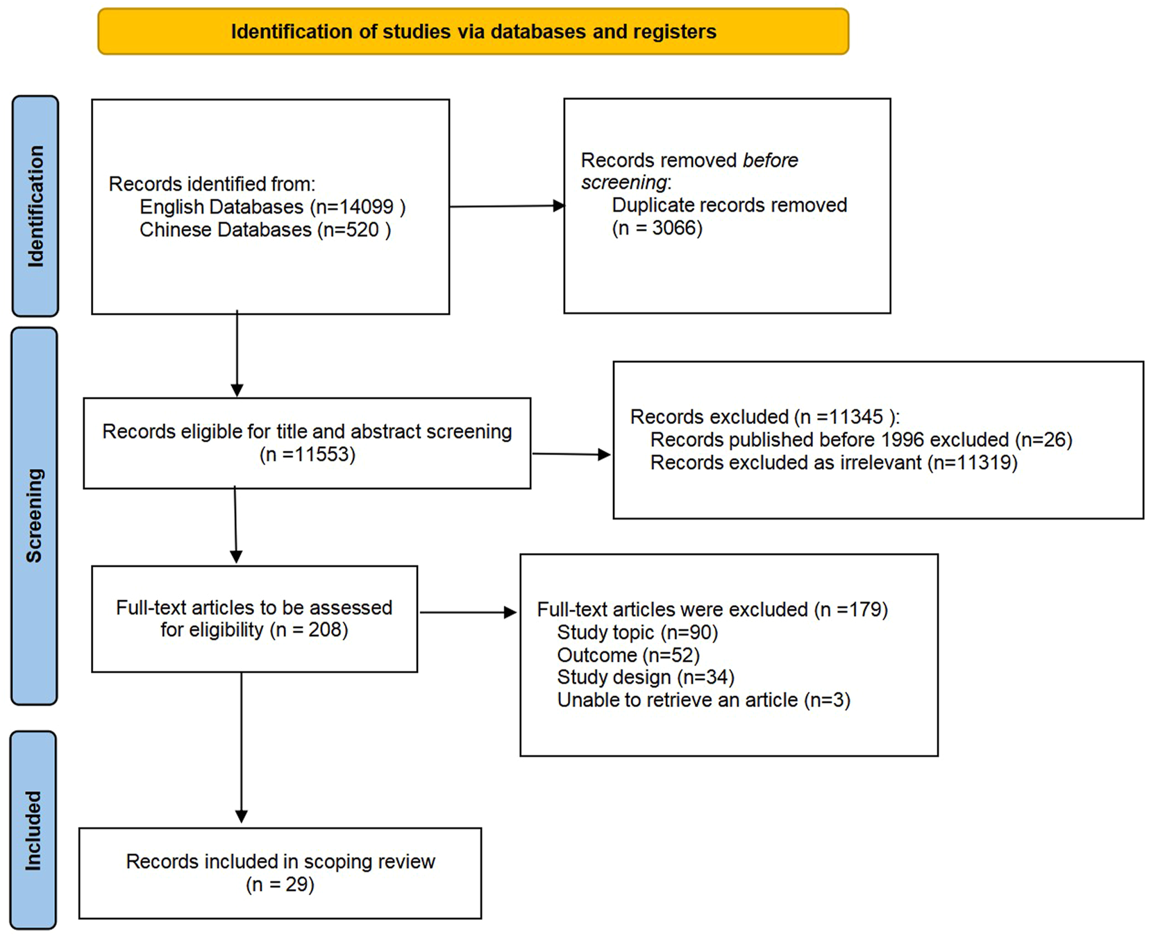 Figure 1 shows the study identification and selection process. A total of 14,619 records were retrieved from the electronic databases. After duplicates were removed, a total of 11,553 records remained for the screening of titles, abstracts, and full texts. Ultimately, 29 studies were deemed eligible and included in the scoping review.