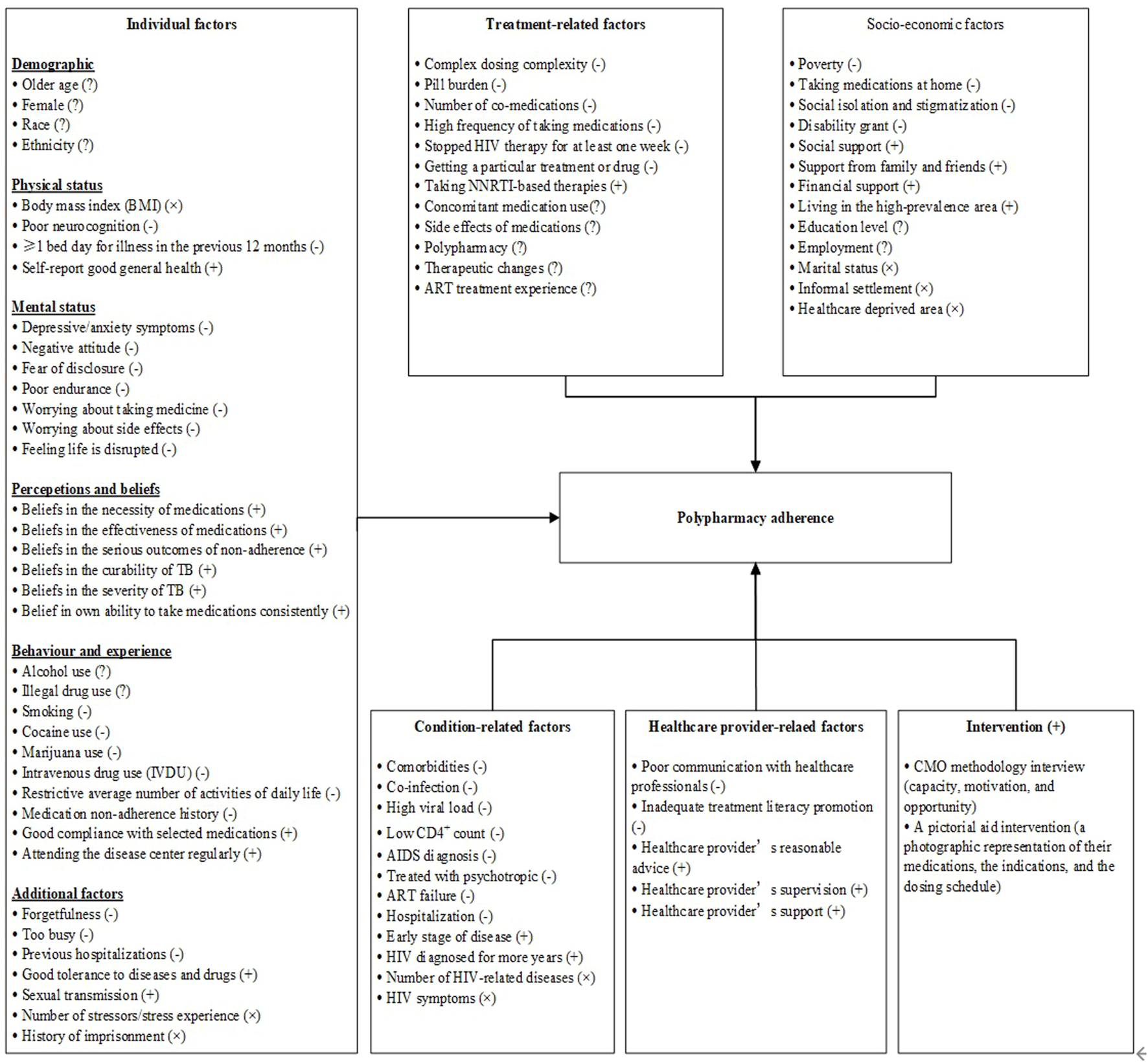 A total of 80 reviewed factors (see Supplementary Table S1) were grouped into five categories: individual factors, condition-related factors, treatment-related factors, health provider-related factors, and socioeconomic factors. Furthermore, we divided factors of compliance with polypharmacy adherence in PLWH into four categories, namely, barriers (−), facilitators (+), inconsistent factors (?), and not significantly associated factors (×), as detailed in Figure 2.